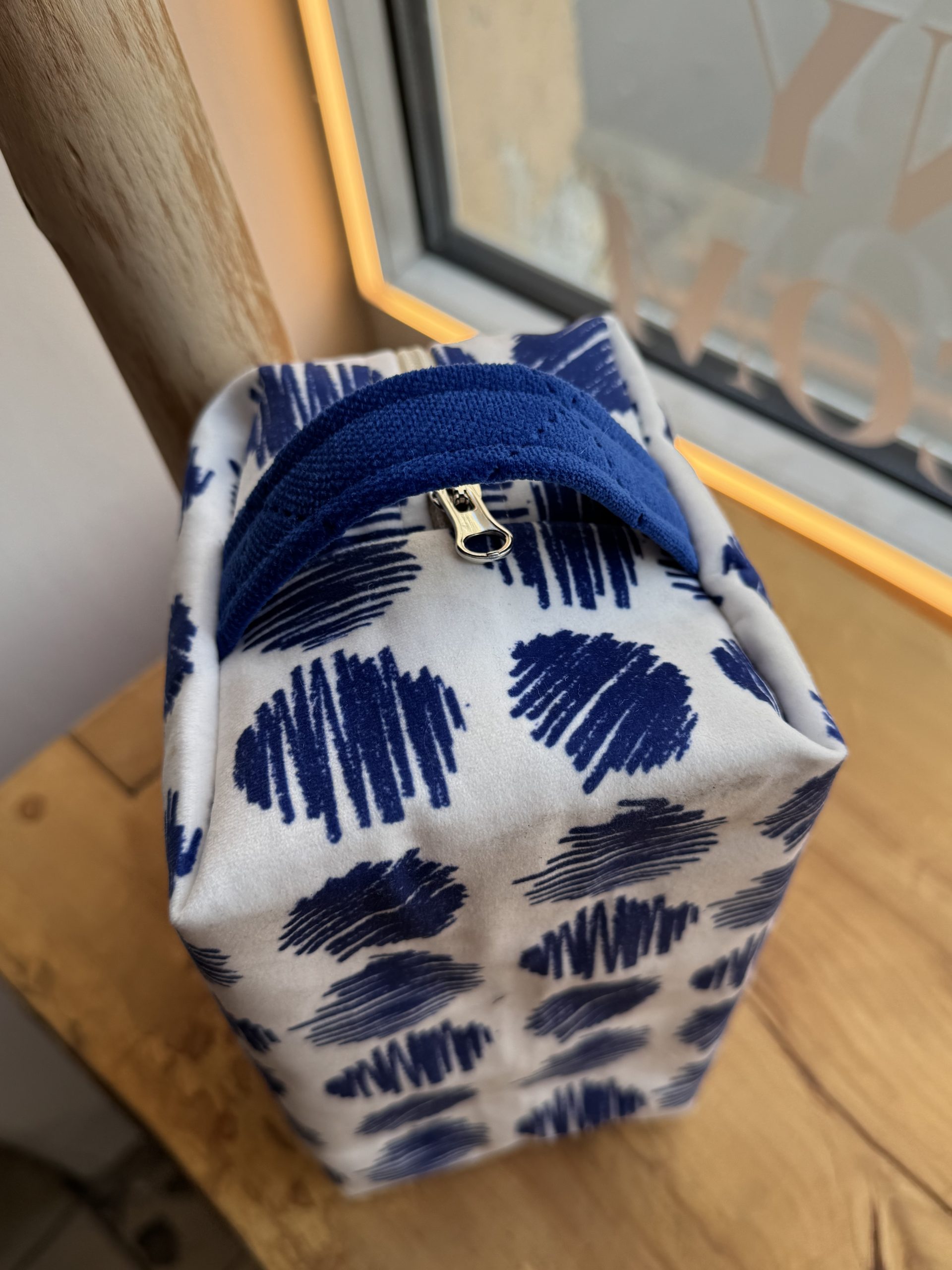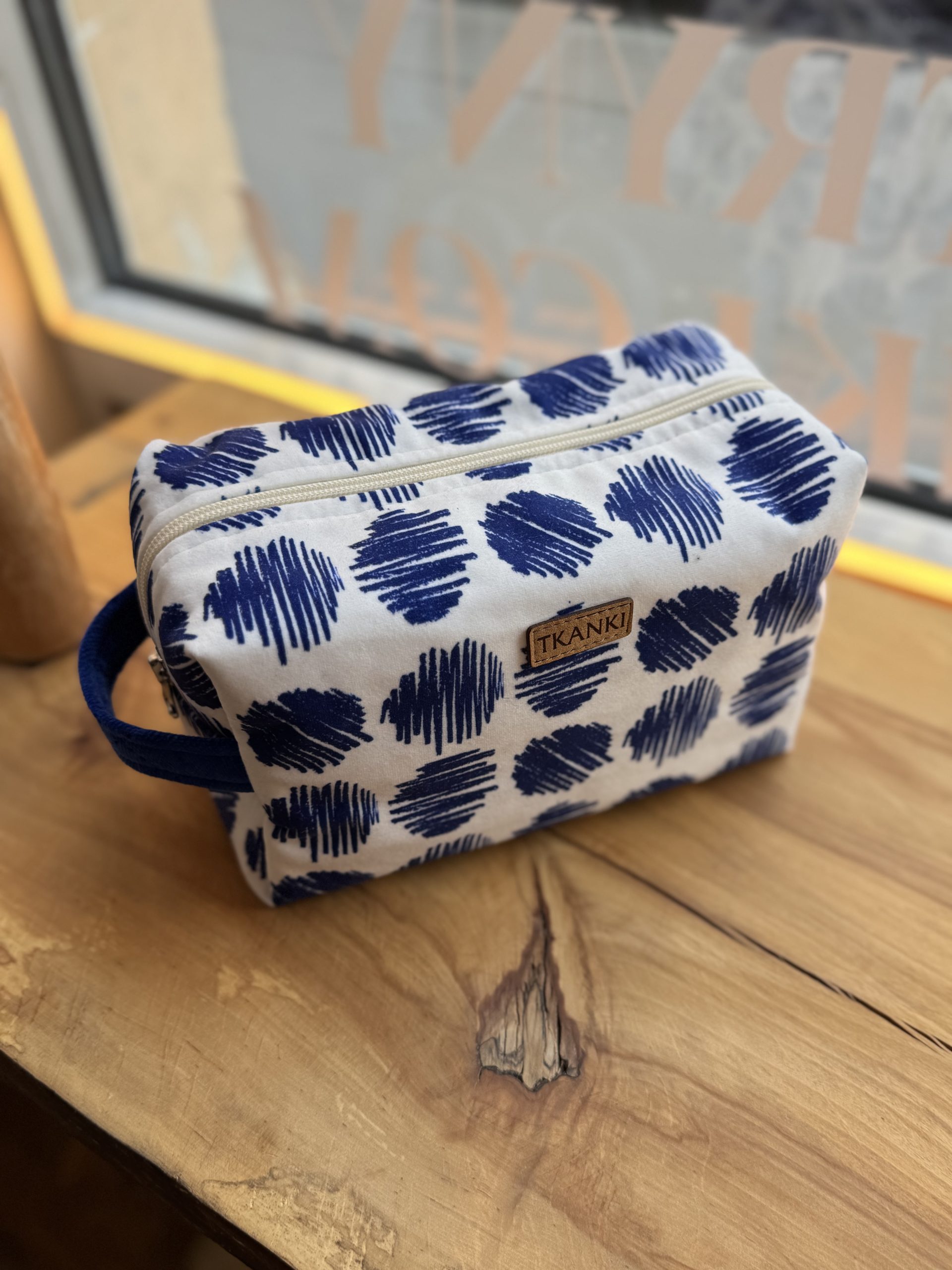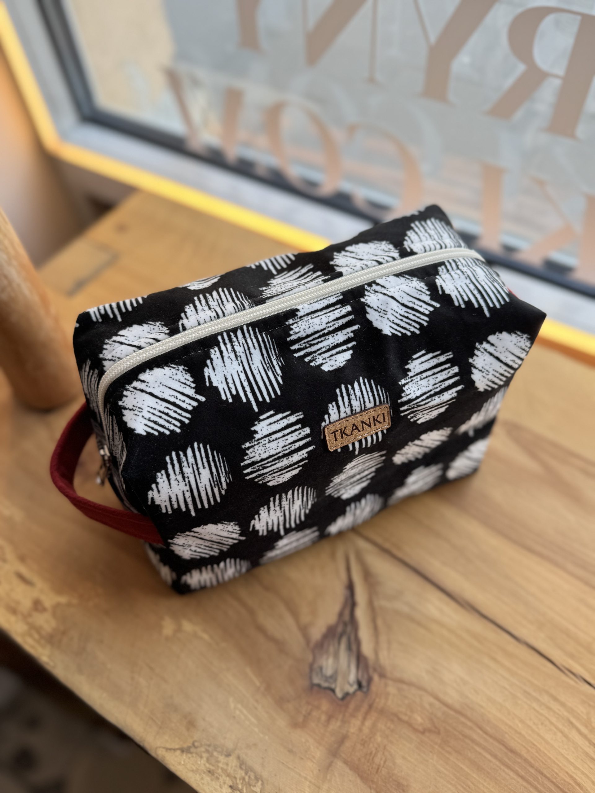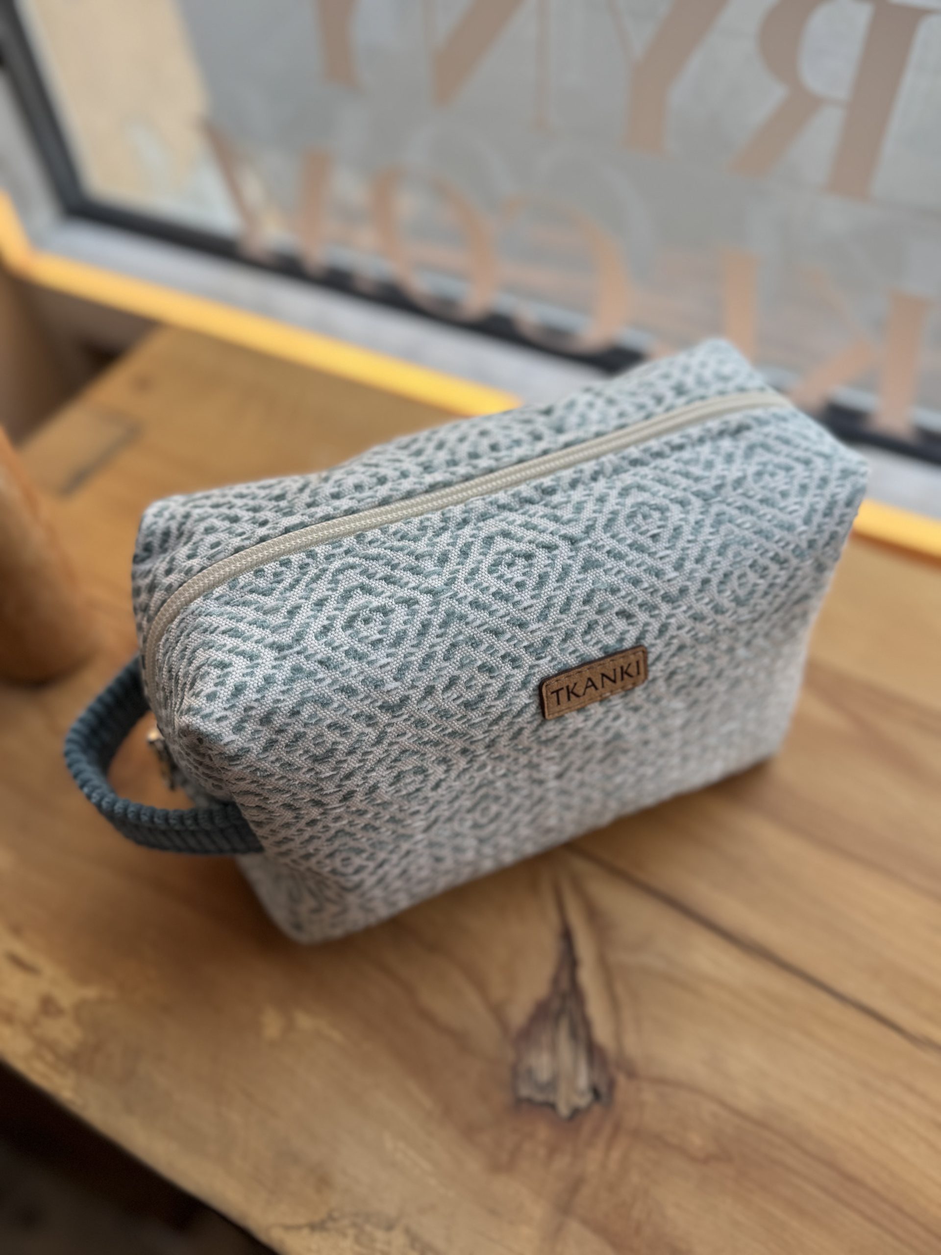 Kosmetyczka uszyta w duchu idei zero waste z niepotrzebnych materiałów. Ma główną komorę podzieloną na środku kieszonką zapinaną na suwak (można w niej schować różne drobiazgi), dodatkowo na jednej ze ścian bocznych naszyta jest kieszeń ściągana gumką. Wykończona wodoodporną podszewką. Kosmetyczka uszyta w jednym egzemplarzu, od początku od końca powstawał w naszej pracowni.