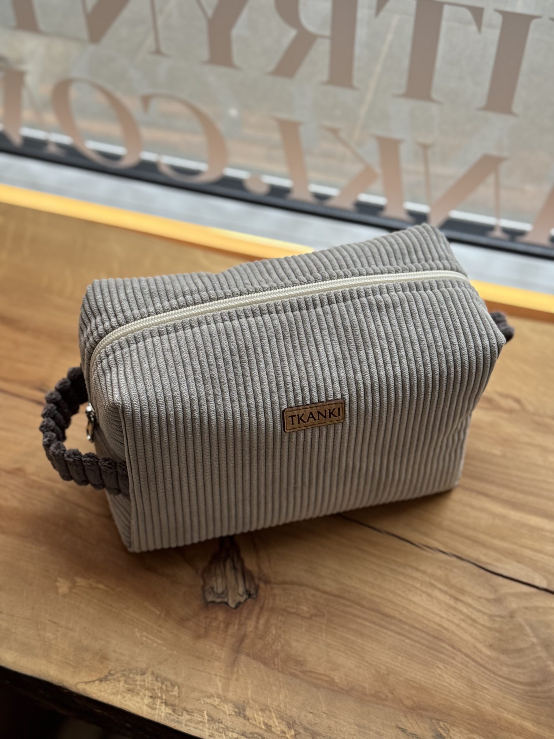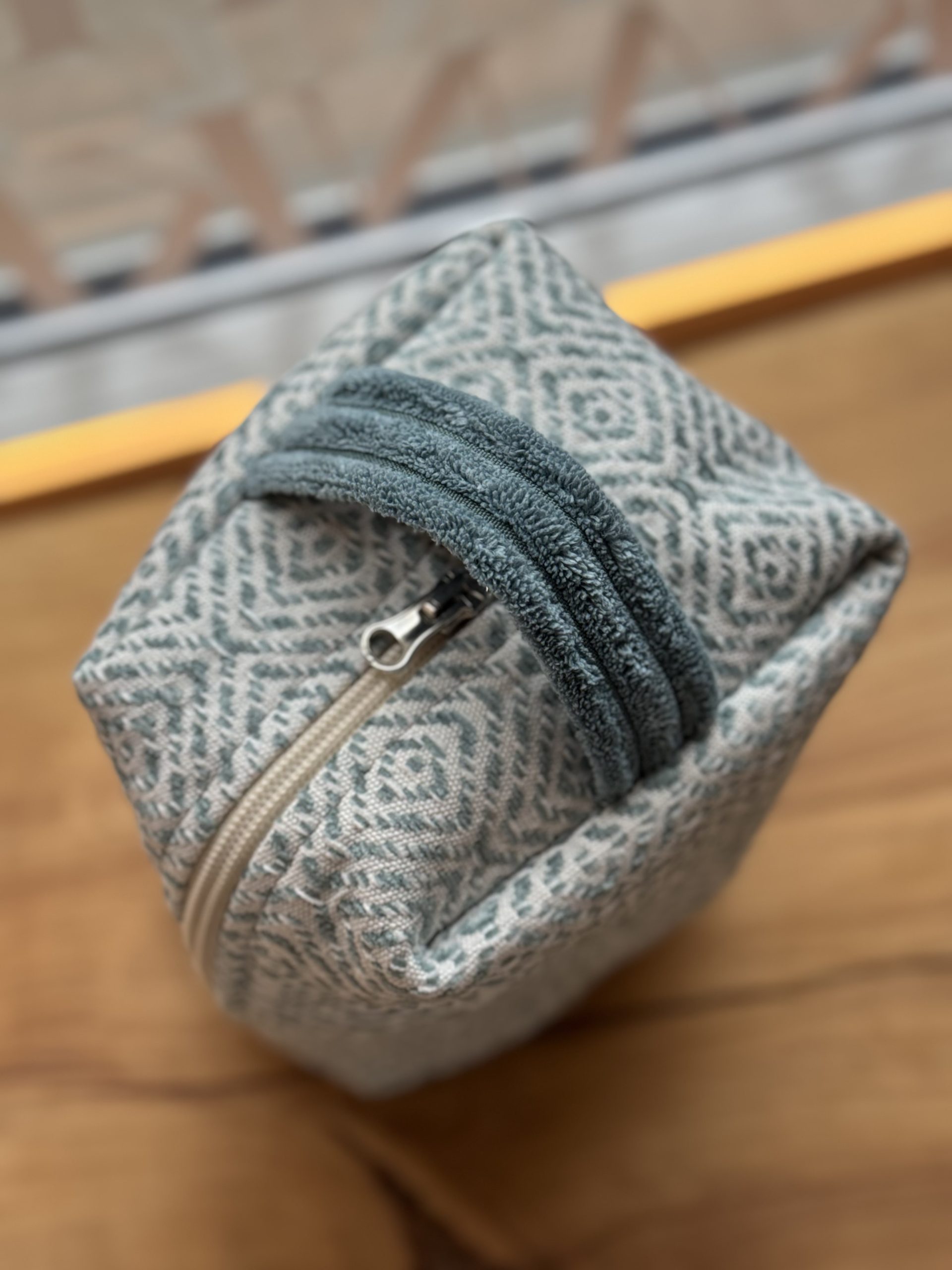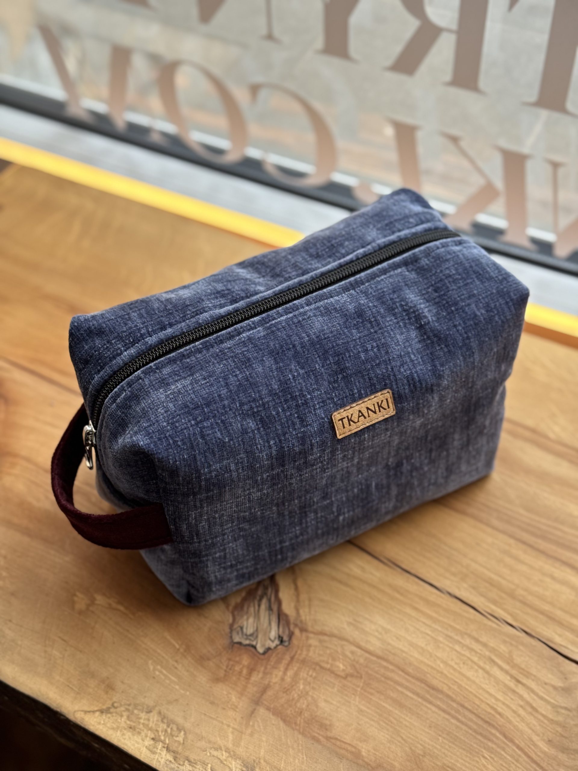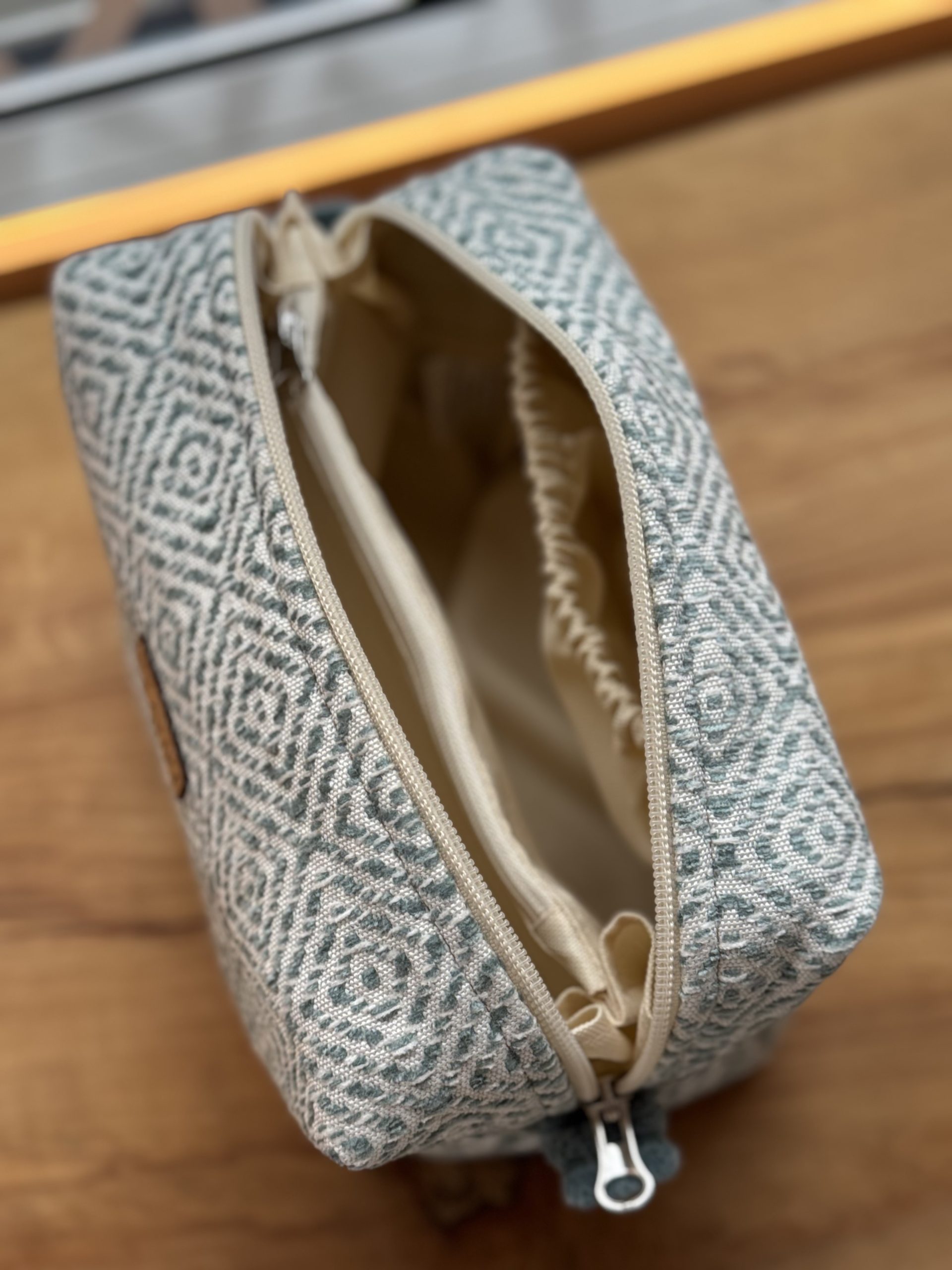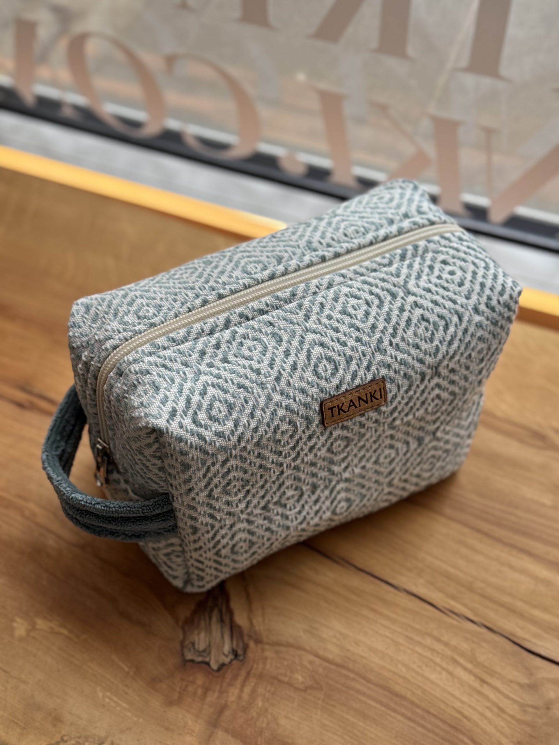 Kosmetyczka uszyta w duchu idei zero waste z niepotrzebnych materiałów. Ma główną komorę podzieloną na środku kieszonką zapinaną na suwak (można w niej schować różne drobiazgi), dodatkowo na jednej ze ścian bocznych naszyta jest kieszeń ściągana gumką. Wykończona wodoodporną podszewką. Kosmetyczka uszyta w jednym egzemplarzu, od początku od końca powstawał w naszej pracowni.