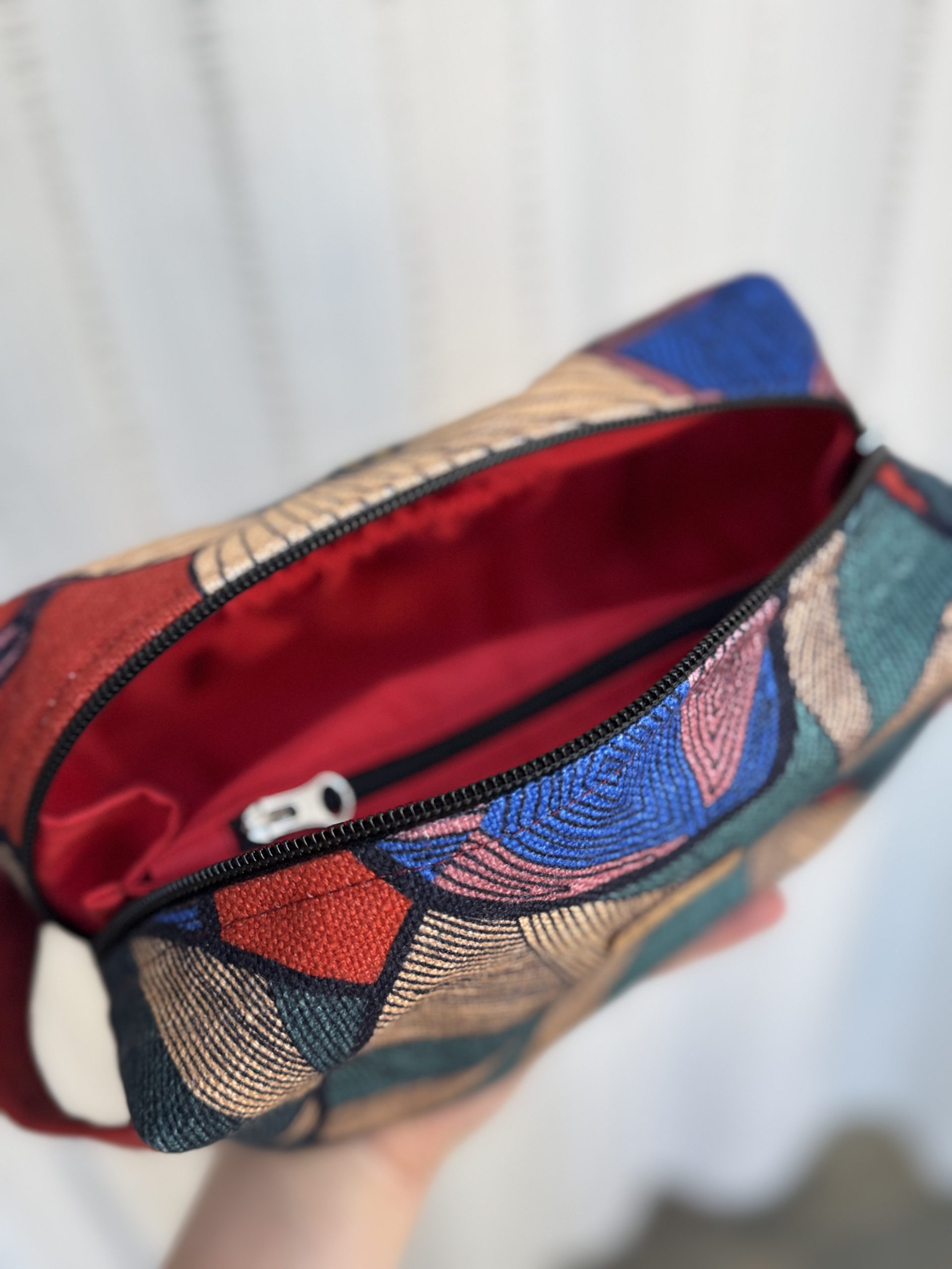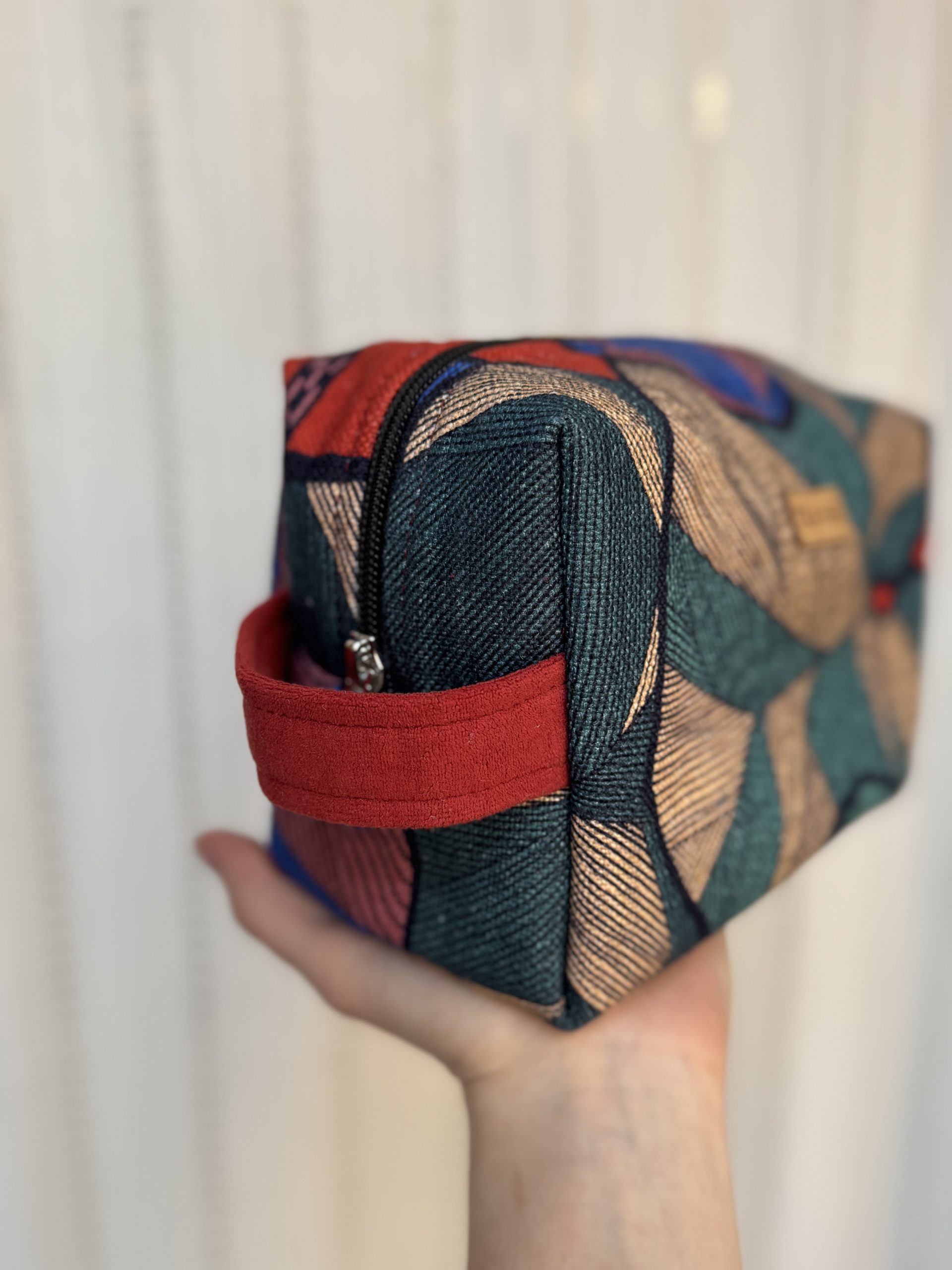 Kosmetyczka uszyta w duchu idei zero waste z niepotrzebnych materiałów. Ma główną komorę podzieloną na środku kieszonką zapinaną na suwak (można w niej schować różne drobiazgi), dodatkowo na jednej ze ścian bocznych naszyta jest kieszeń ściągana gumką. Wykończona wodoodporną podszewką. Kosmetyczka uszyta w jednym egzemplarzu, od początku od końca powstawał w naszej pracowni.