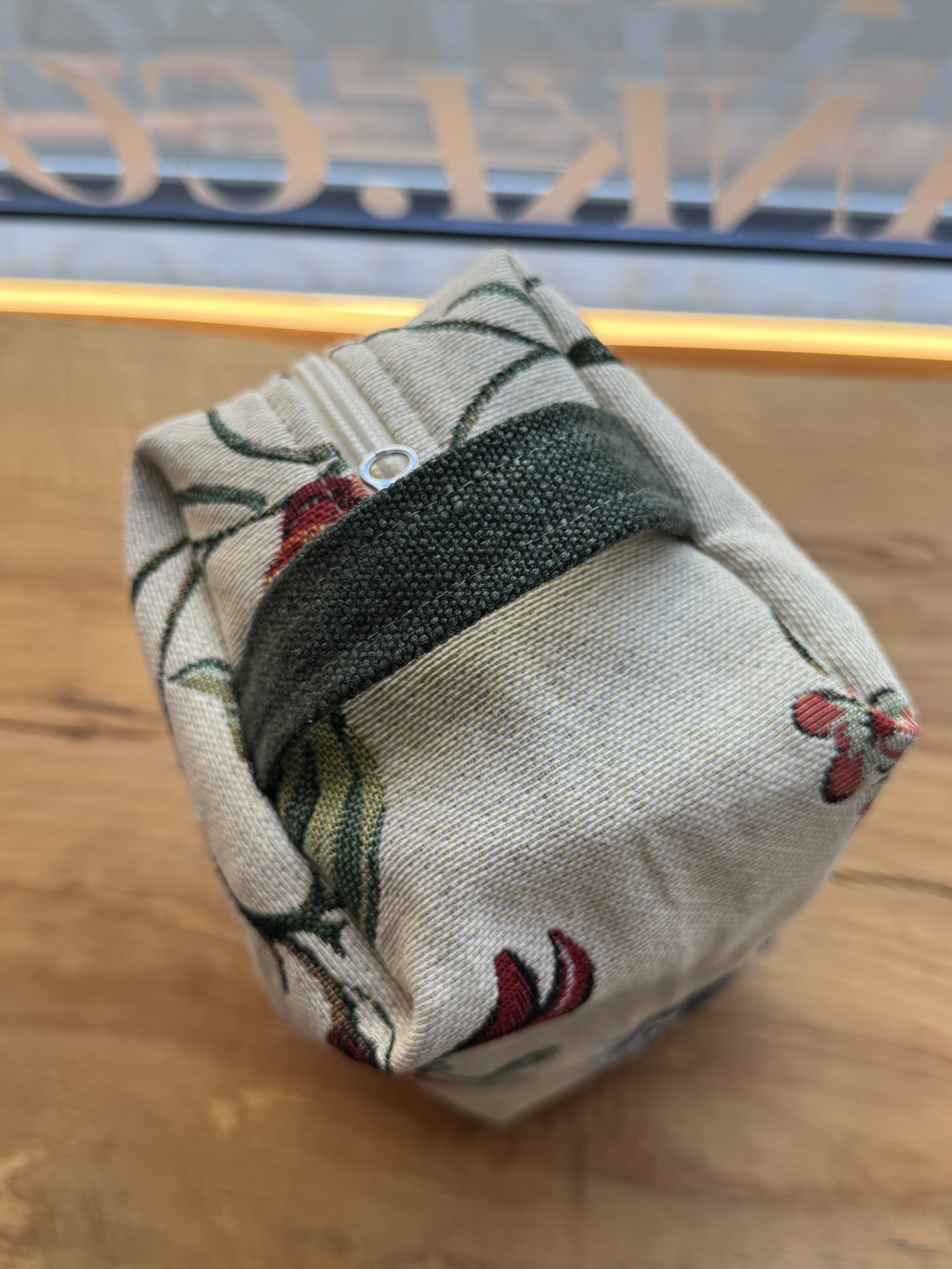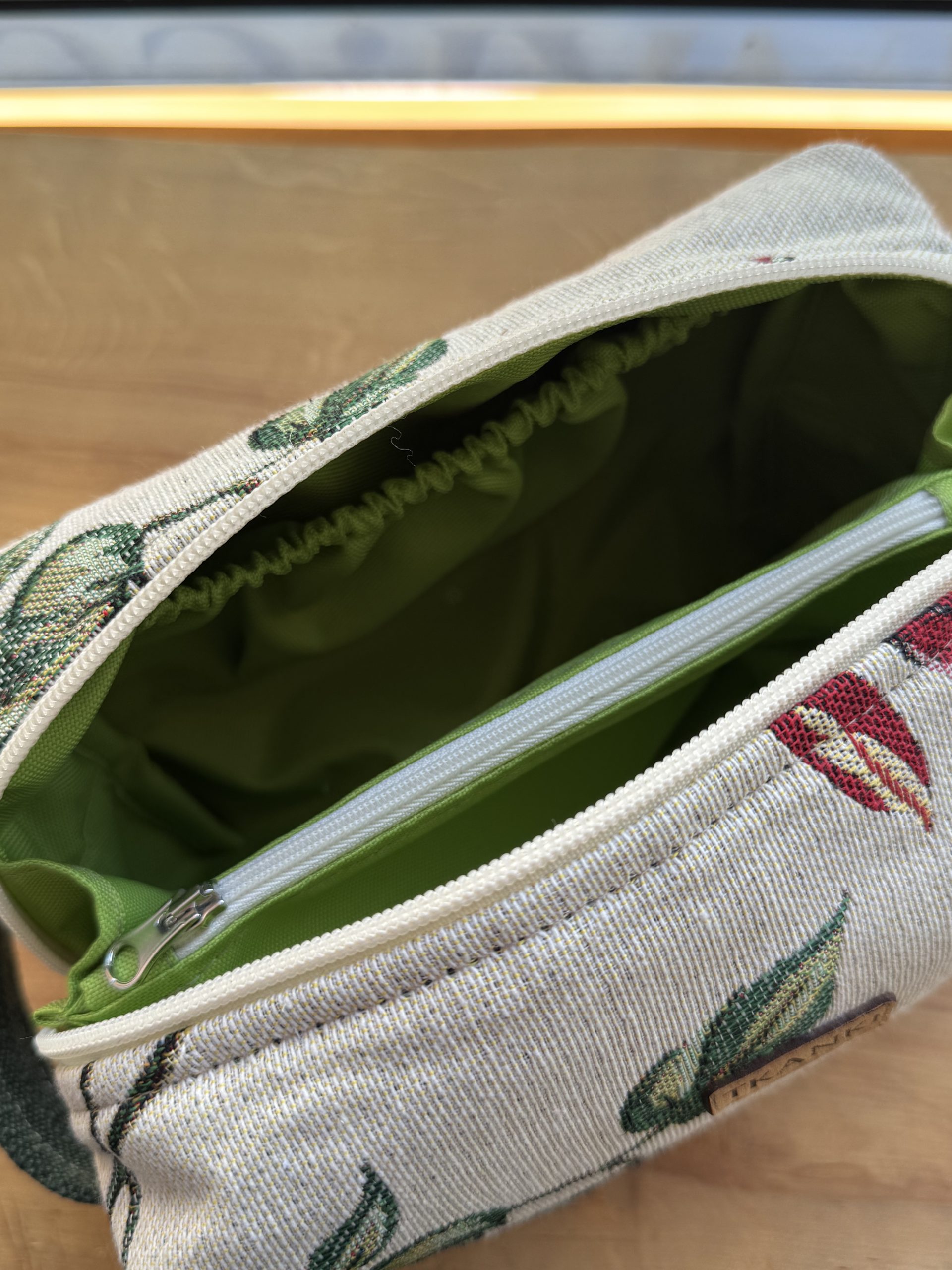 Kosmetyczka uszyta w duchu idei zero waste z niepotrzebnych materiałów. Ma główną komorę podzieloną na środku kieszonką zapinaną na suwak (można w niej schować różne drobiazgi), dodatkowo na jednej ze ścian bocznych naszyta jest kieszeń ściągana gumką. Wykończona wodoodporną podszewką. Kosmetyczka uszyta w jednym egzemplarzu, od początku od końca powstawał w naszej pracowni.