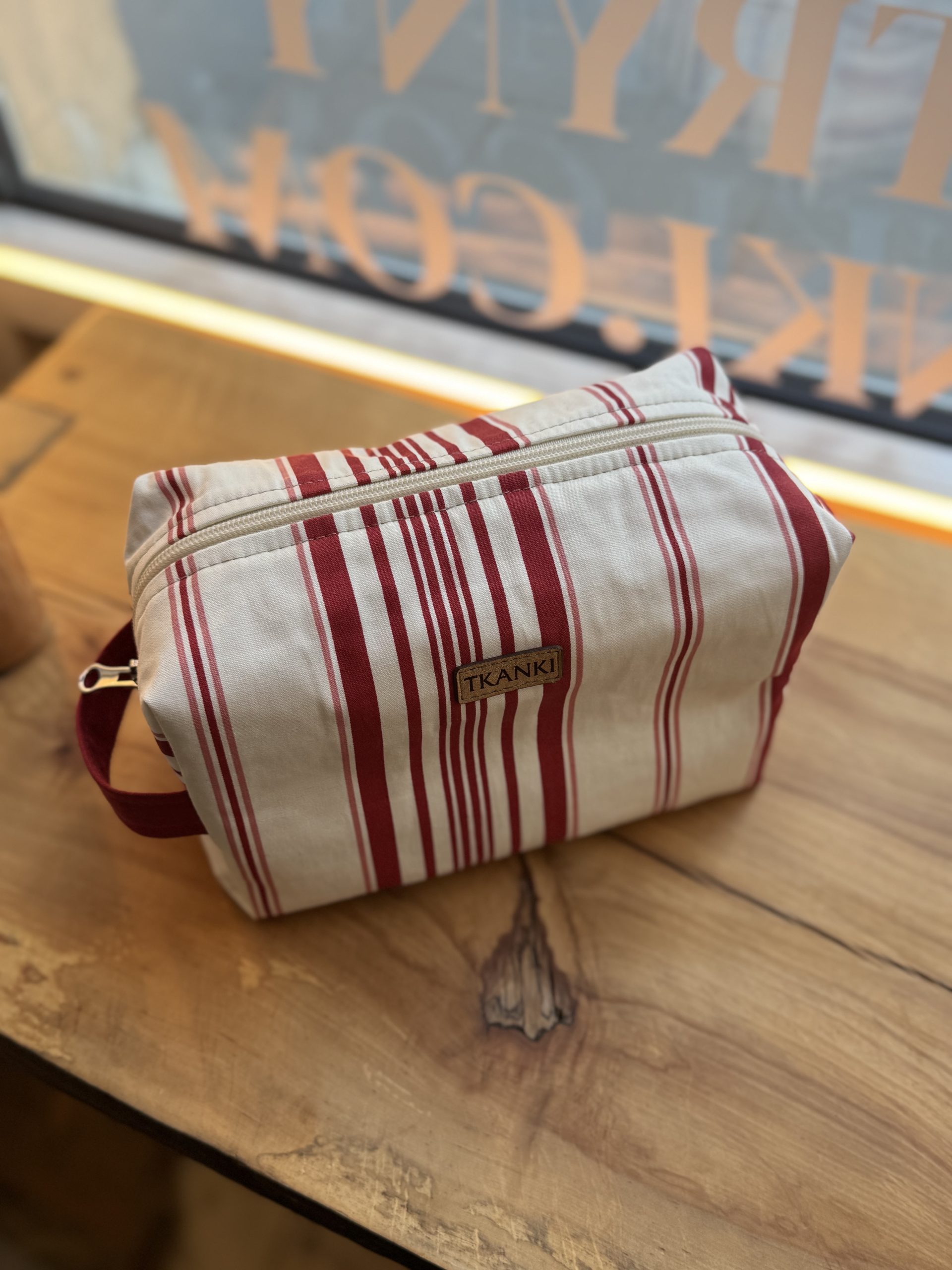 Kosmetyczka uszyta w duchu idei zero waste z niepotrzebnych materiałów. Ma główną komorę podzieloną na środku kieszonką zapinaną na suwak (można w niej schować różne drobiazgi), dodatkowo na jednej ze ścian bocznych naszyta jest kieszeń ściągana gumką. Wykończona wodoodporną podszewką. Kosmetyczka uszyta w jednym egzemplarzu, od początku od końca powstawał w naszej pracowni.