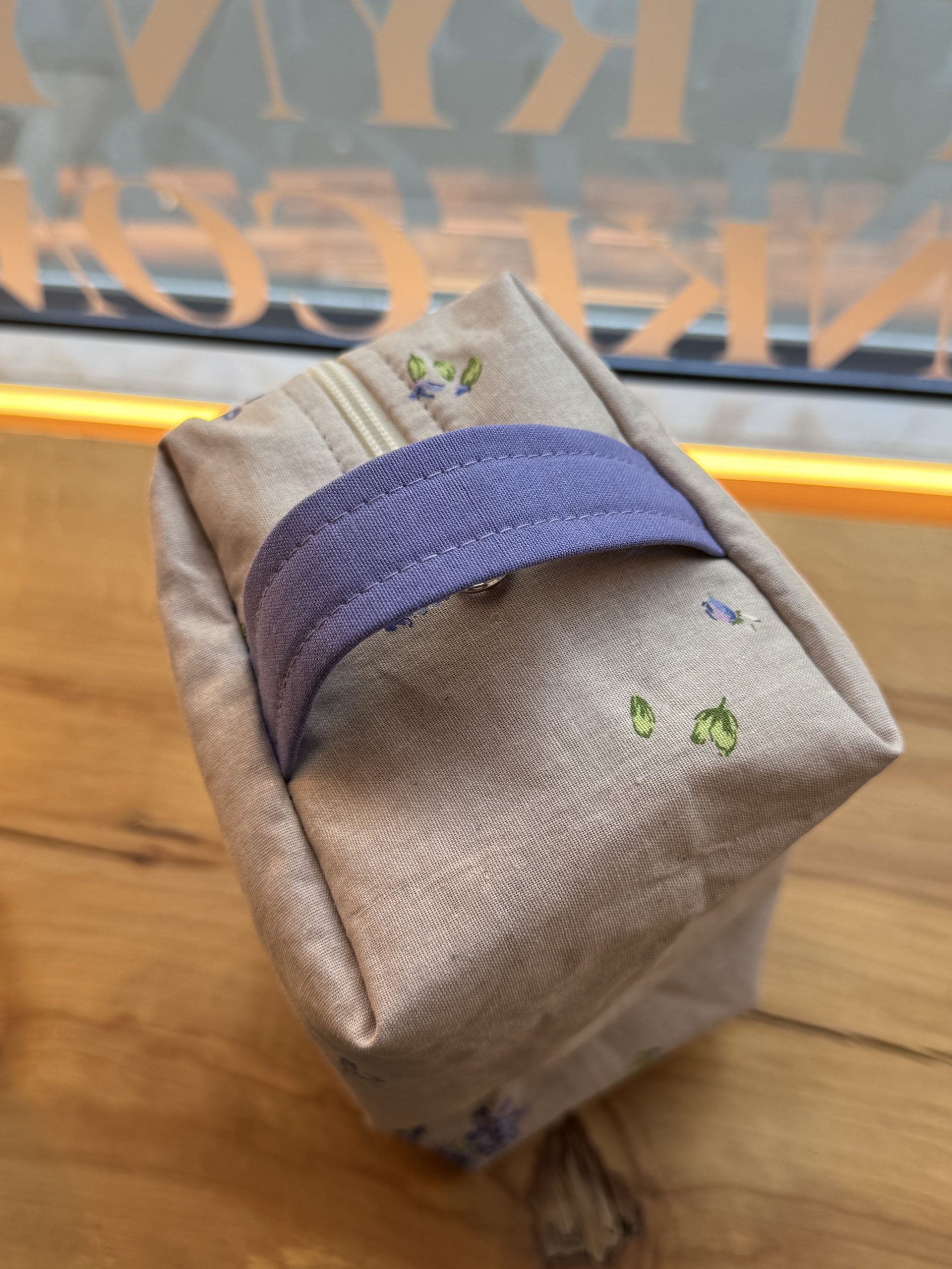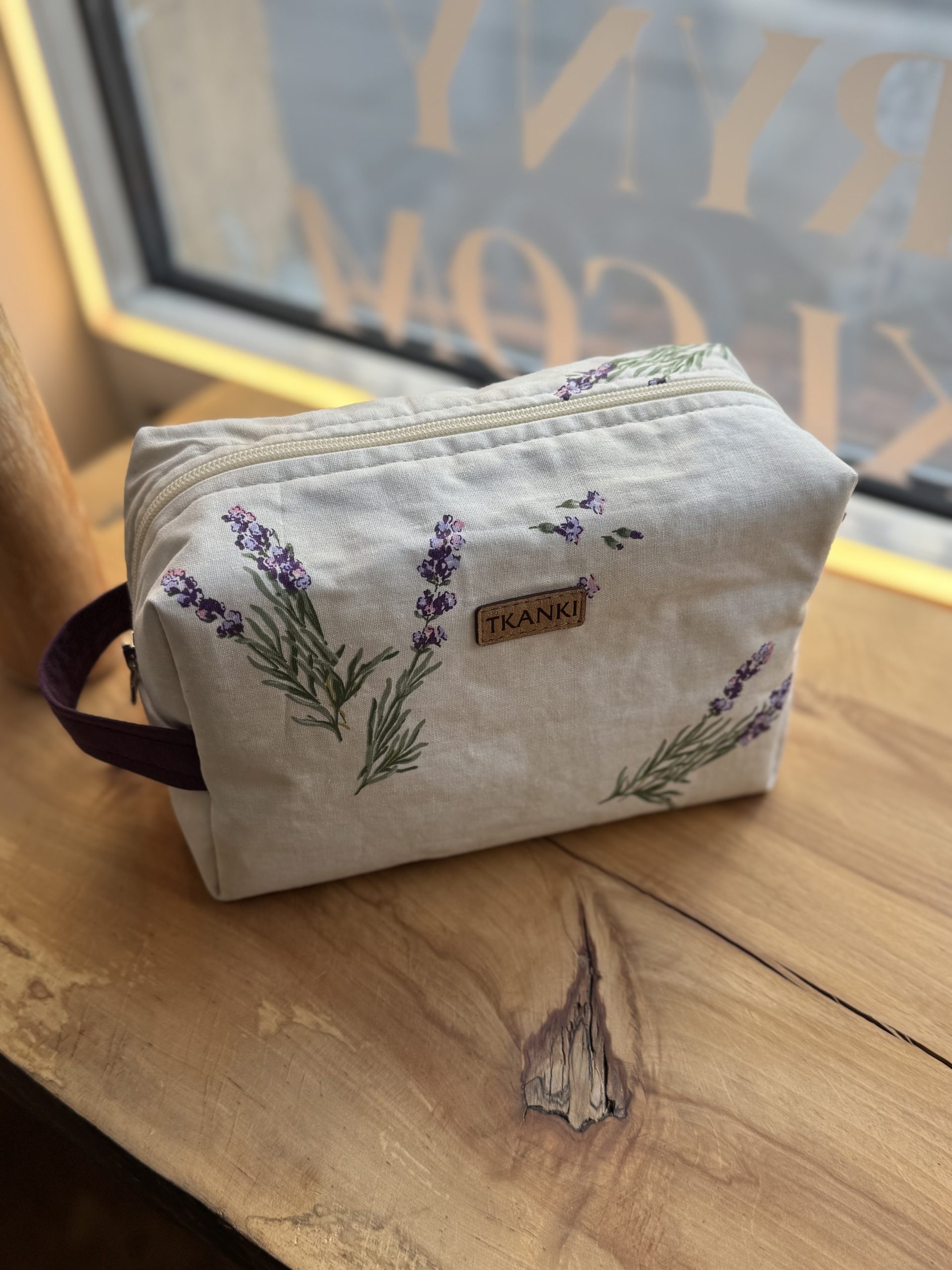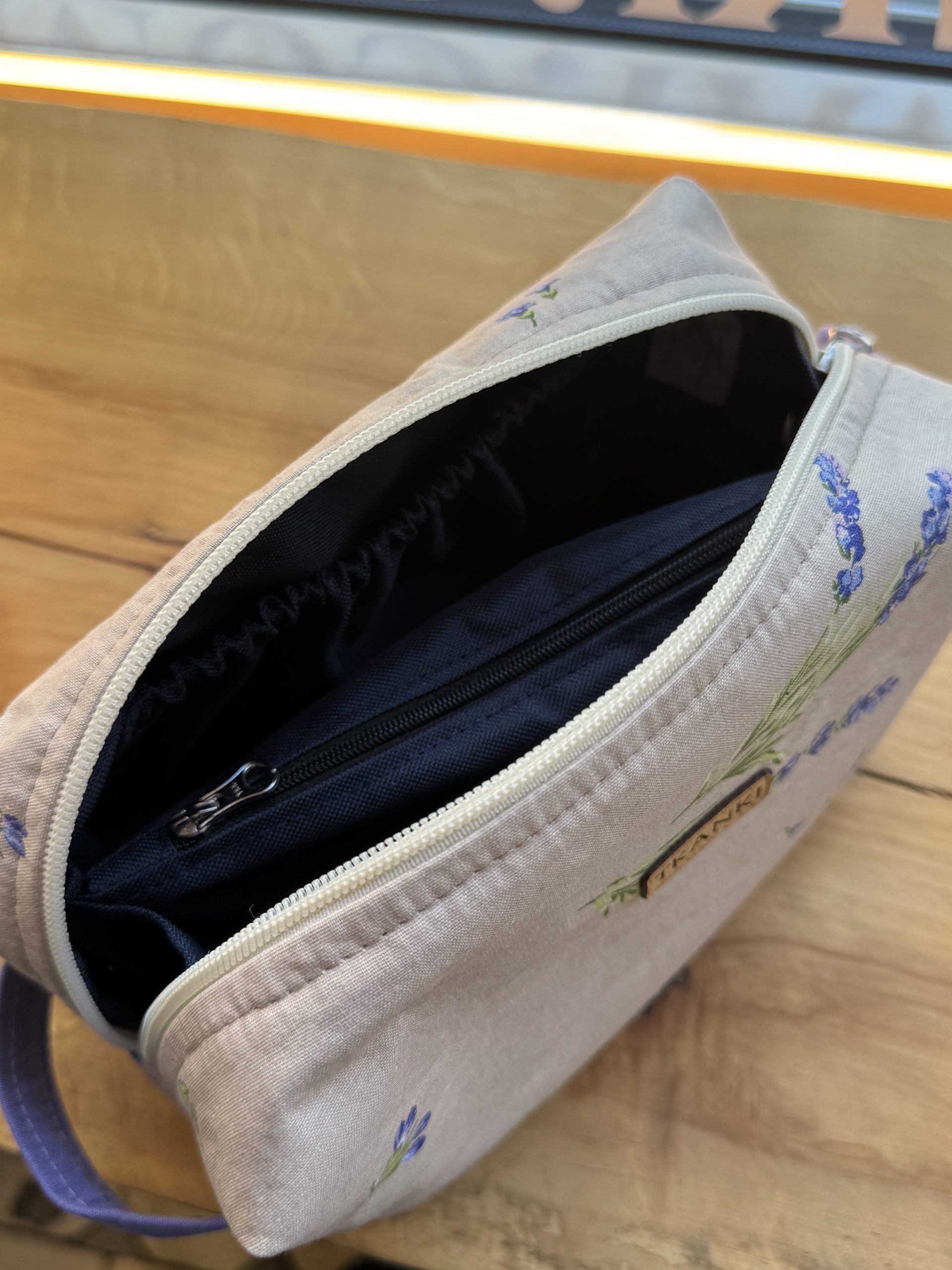 Kosmetyczka uszyta w duchu idei zero waste z niepotrzebnych materiałów. Ma główną komorę podzieloną na środku kieszonką zapinaną na suwak (można w niej schować różne drobiazgi), dodatkowo na jednej ze ścian bocznych naszyta jest kieszeń ściągana gumką. Wykończona wodoodporną podszewką. Kosmetyczka uszyta w jednym egzemplarzu, od początku od końca powstawał w naszej pracowni.