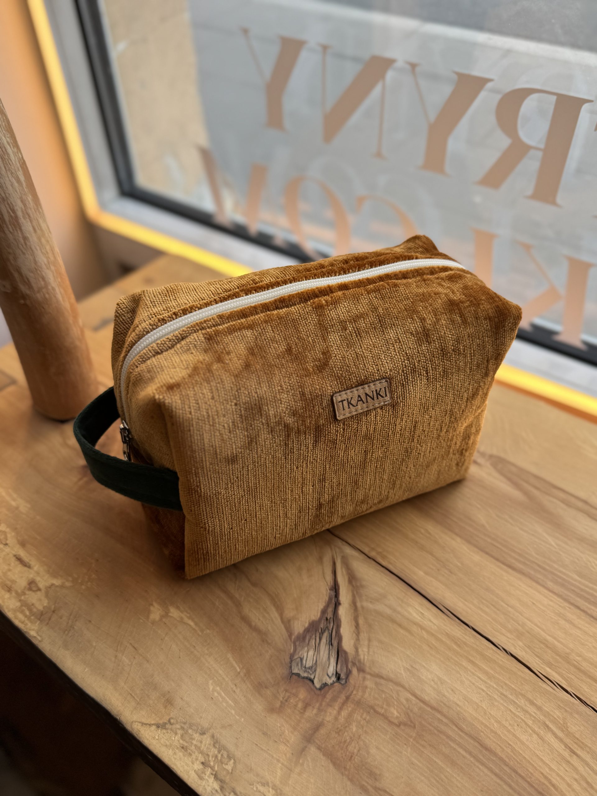 Kosmetyczka uszyta w duchu idei zero waste z niepotrzebnych materiałów. Ma główną komorę podzieloną na środku kieszonką zapinaną na suwak (można w niej schować różne drobiazgi), dodatkowo na jednej ze ścian bocznych naszyta jest kieszeń ściągana gumką. Wykończona wodoodporną podszewką. Kosmetyczka uszyta w jednym egzemplarzu, od początku od końca powstawał w naszej pracowni.