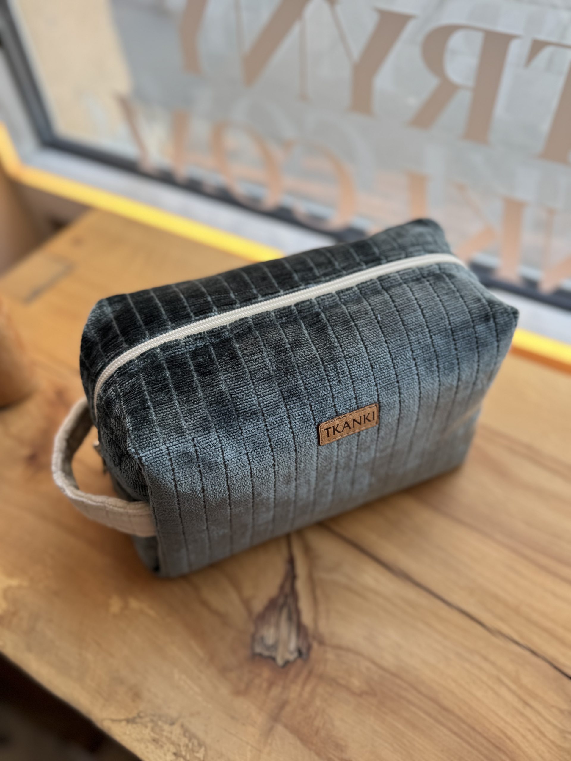 Kosmetyczka uszyta w duchu idei zero waste z niepotrzebnych materiałów. Ma główną komorę podzieloną na środku kieszonką zapinaną na suwak (można w niej schować różne drobiazgi), dodatkowo na jednej ze ścian bocznych naszyta jest kieszeń ściągana gumką. Wykończona wodoodporną podszewką. Kosmetyczka uszyta w jednym egzemplarzu, od początku od końca powstawał w naszej pracowni.