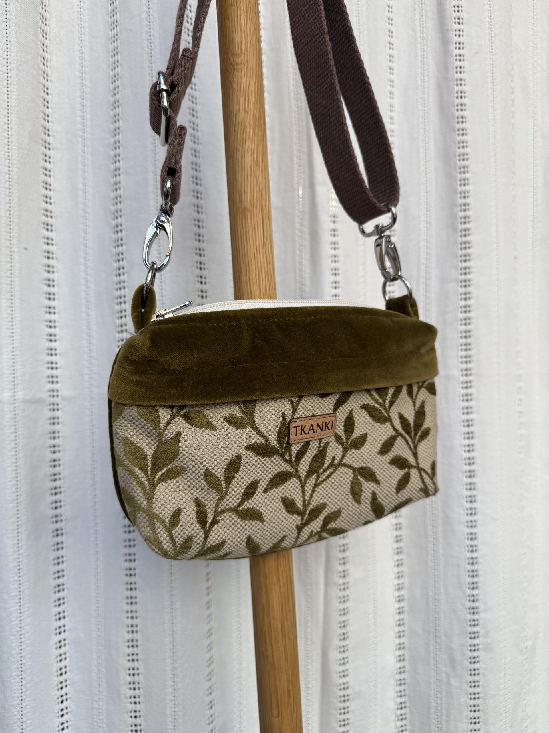 Nerka-torebka uszyta tylko w jednym egzemplarzu. Wykończona podszewką, ma kieszeń z przodu zapinaną na suwak ukryty pod patką oraz kieszeń główną. Uszyta ze ścinków tkanin tapicerskich. Nerka pięknie się układa niezależnie od tego, czy w środku jest mniej czy więcej rzeczy. Z przodu naszyta subtelna metka.