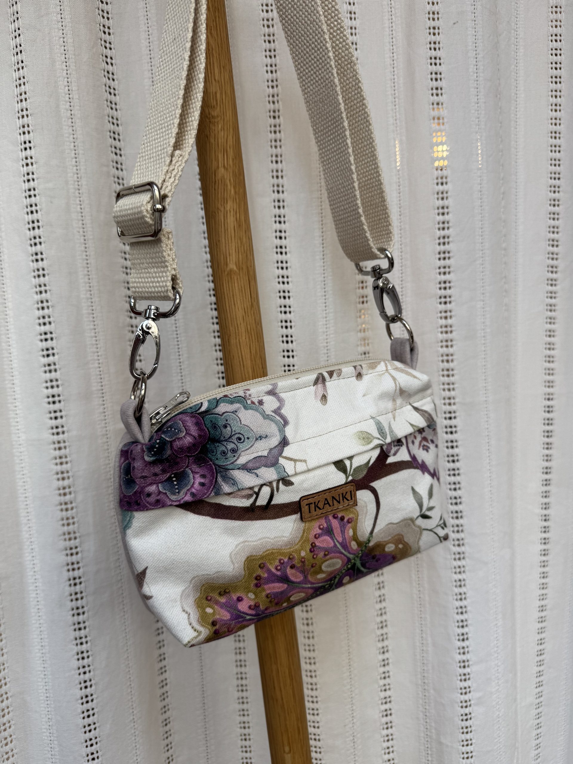 Nerka-torebka uszyta tylko w jednym egzemplarzu. Wykończona podszewką, ma kieszeń z przodu zapinaną na suwak ukryty pod patką oraz kieszeń główną. Uszyta ze ścinków tkanin tapicerskich. Nerka pięknie się układa niezależnie od tego, czy w środku jest mniej czy więcej rzeczy. Z przodu naszyta subtelna metka.