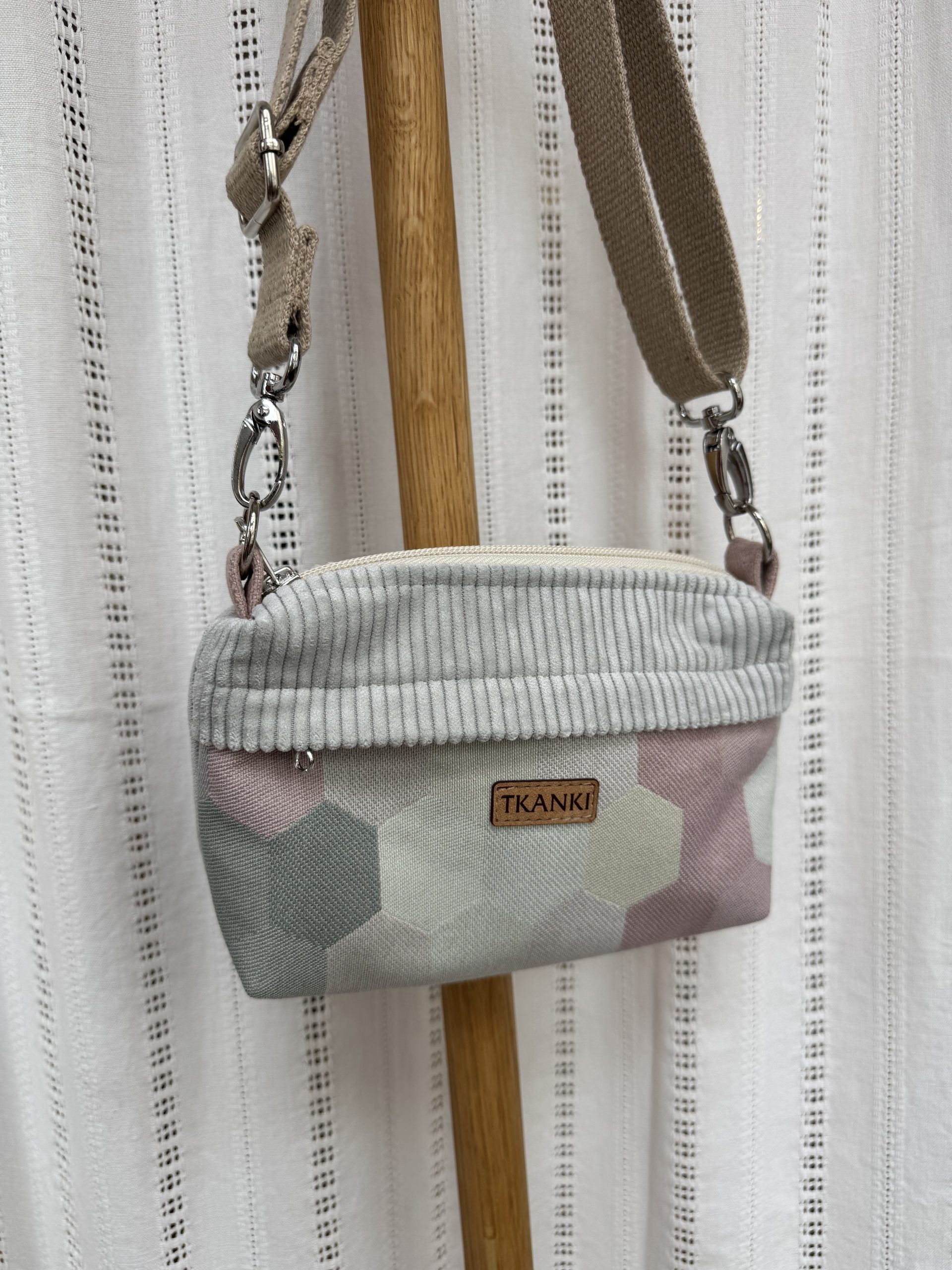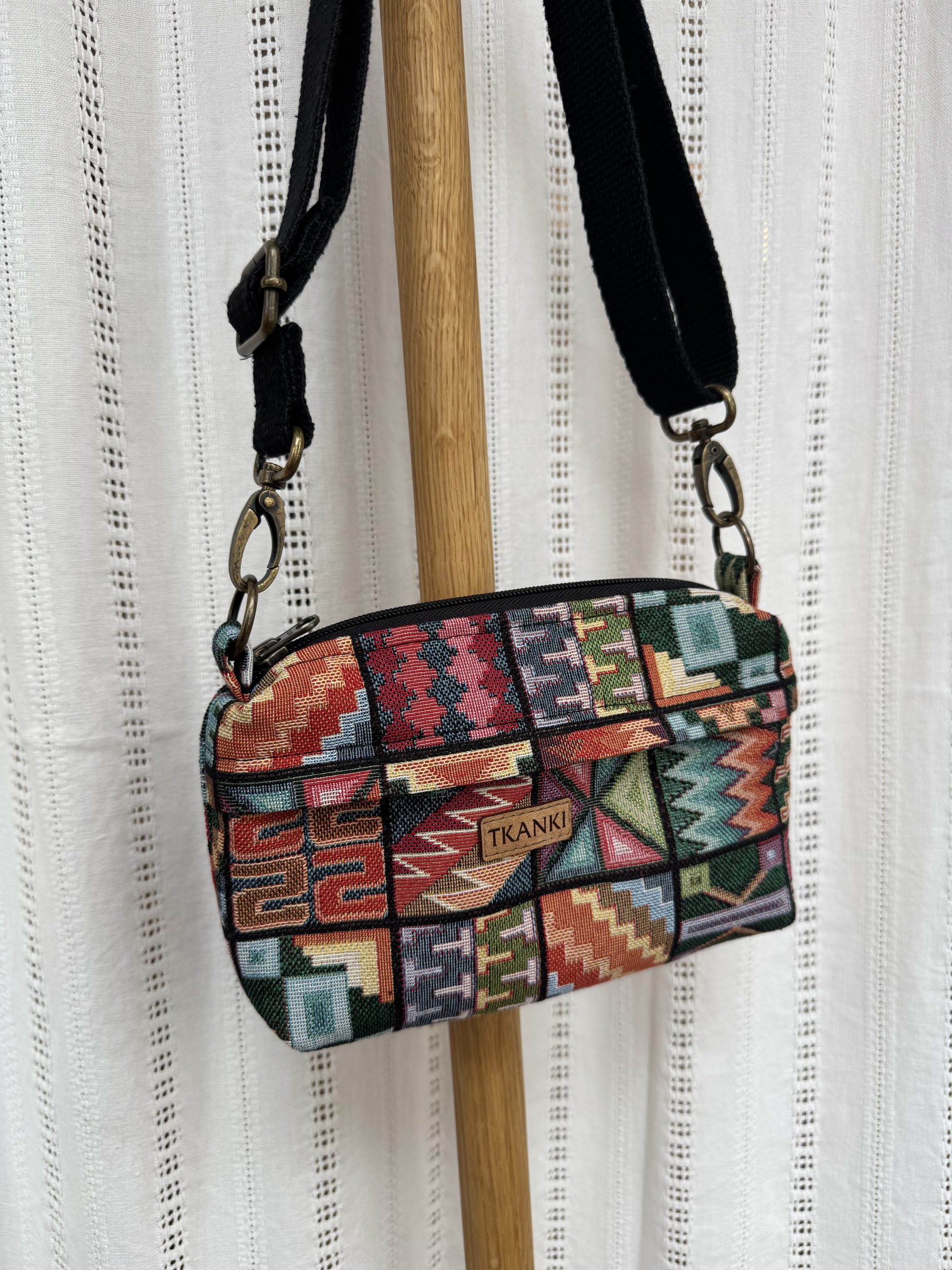 Nerka-torebka uszyta tylko w jednym egzemplarzu. Wykończona podszewką, ma kieszeń z przodu zapinaną na suwak ukryty pod patką oraz kieszeń główną. Uszyta ze ścinków tkanin tapicerskich. Nerka pięknie się układa niezależnie od tego, czy w środku jest mniej czy więcej rzeczy. Z przodu naszyta subtelna metka.