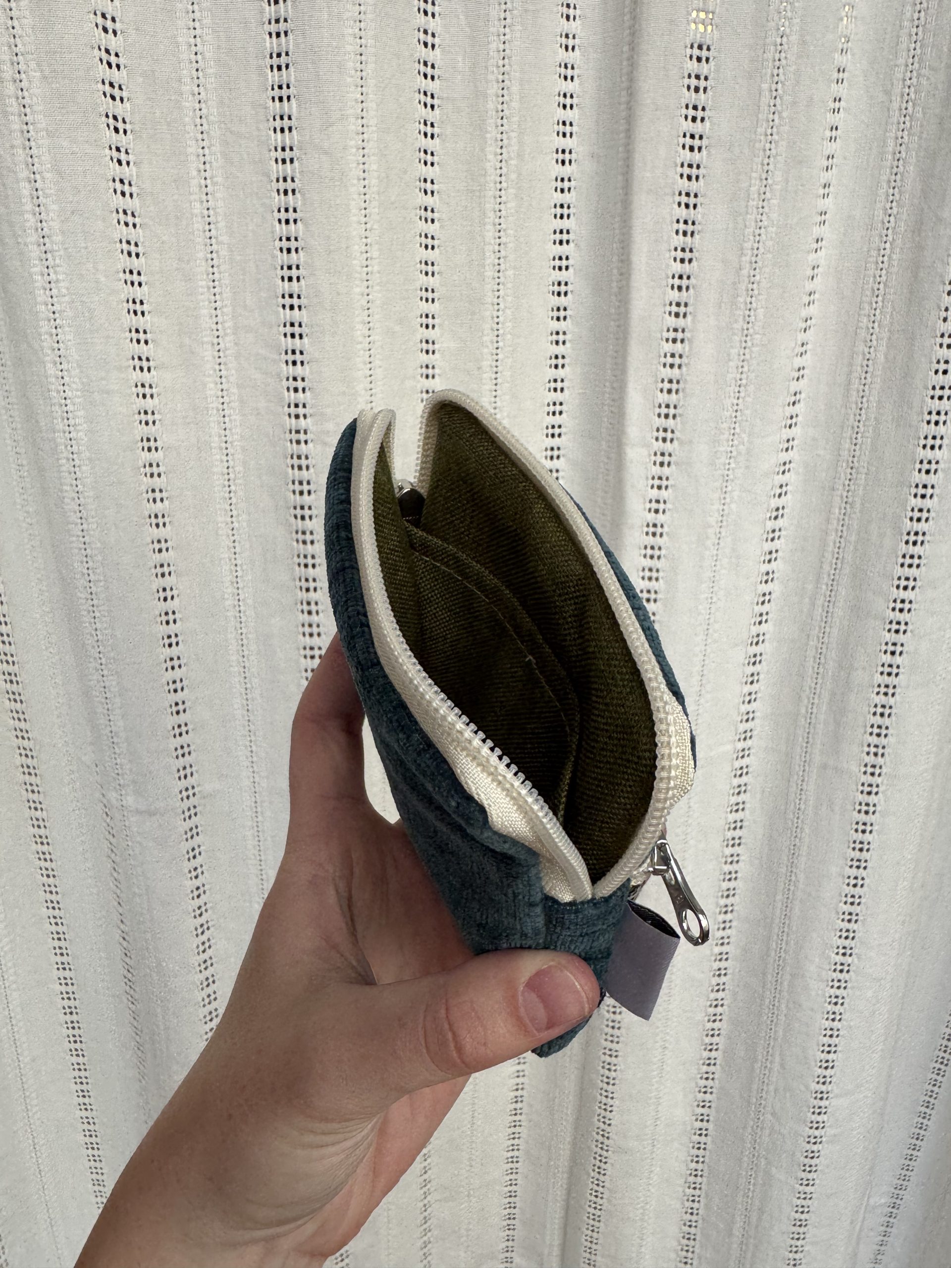 Portfel uszyty w duchu idei zero warte z niepotrzebnych materiałów. Ma dwie kieszenie zapinane na suwak i jedną usztywnianą przegródkę w środku na karty. Wykończony bawełnianą podszewką. Portfelik uszyty w jednym egzemplarzu, od początku od końca powstawał w naszej pracowni.