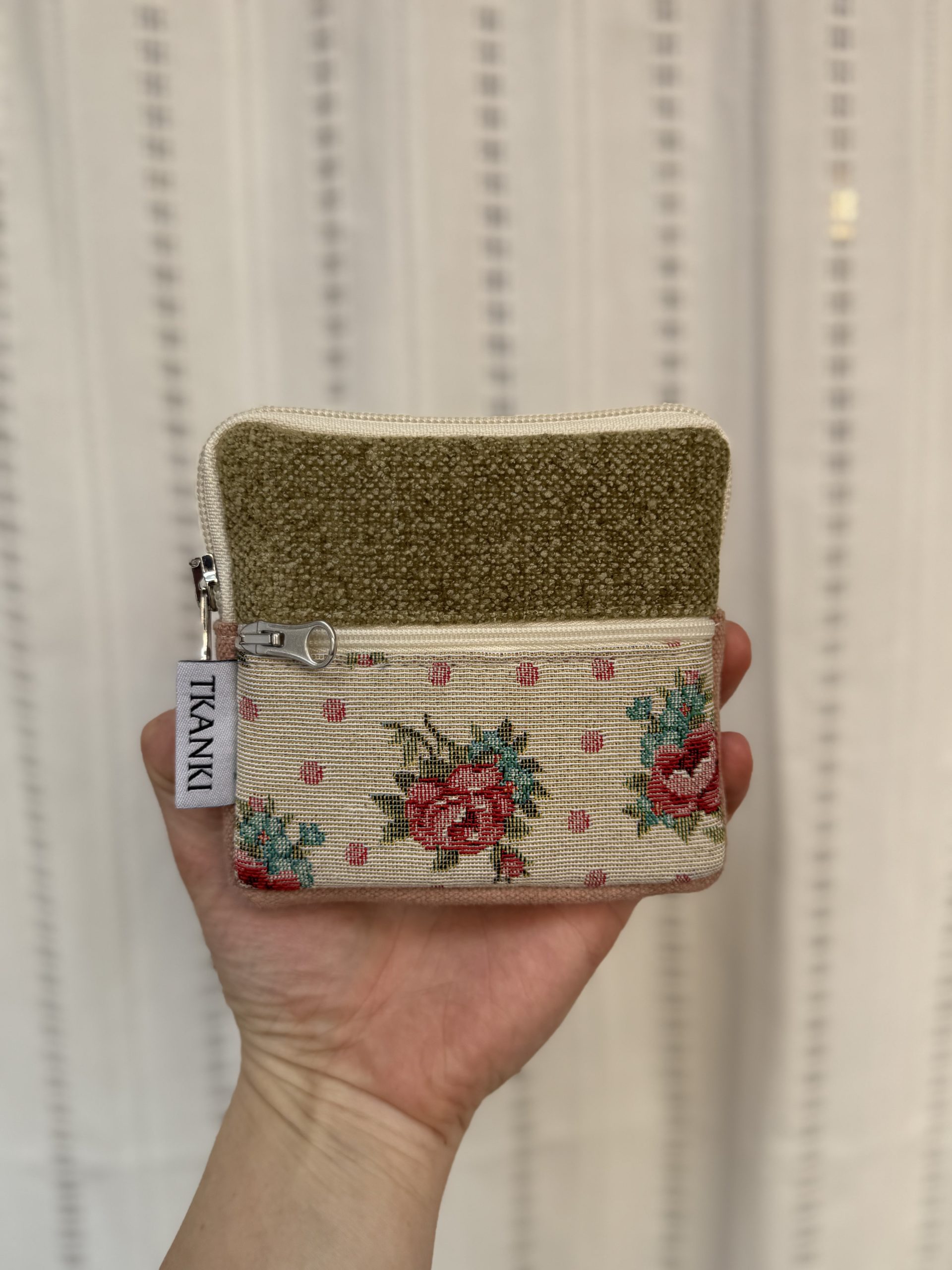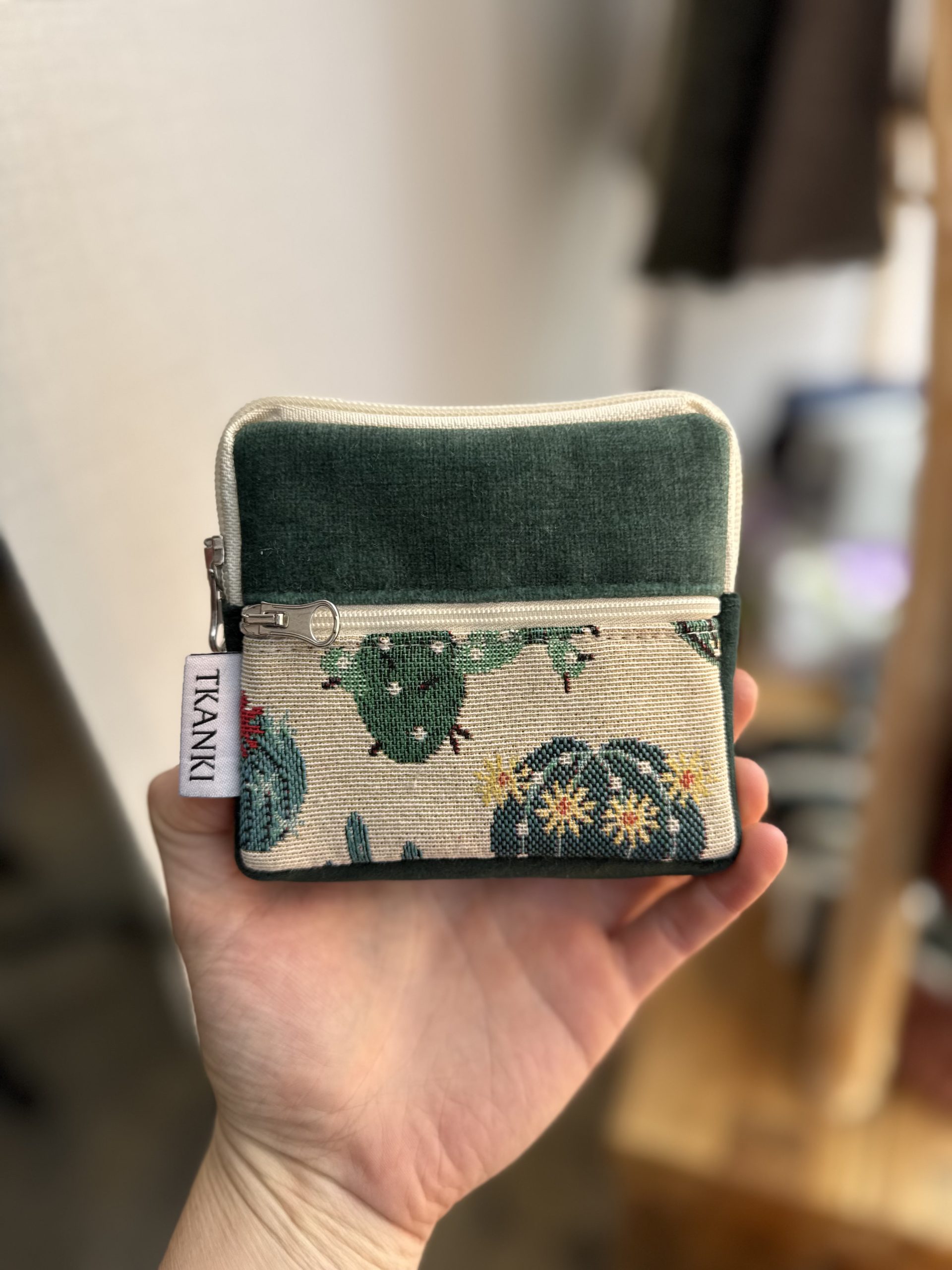 Portfel uszyty w duchu idei zero waste z niepotrzebnych materiałów. Ma dwie kieszenie zapinane na suwak i jedną usztywnianą przegródkę w środku na karty. Wykończony bawełnianą podszewką. Portfelik uszyty w jednym egzemplarzu, od początku od końca powstawał w naszej pracowni.