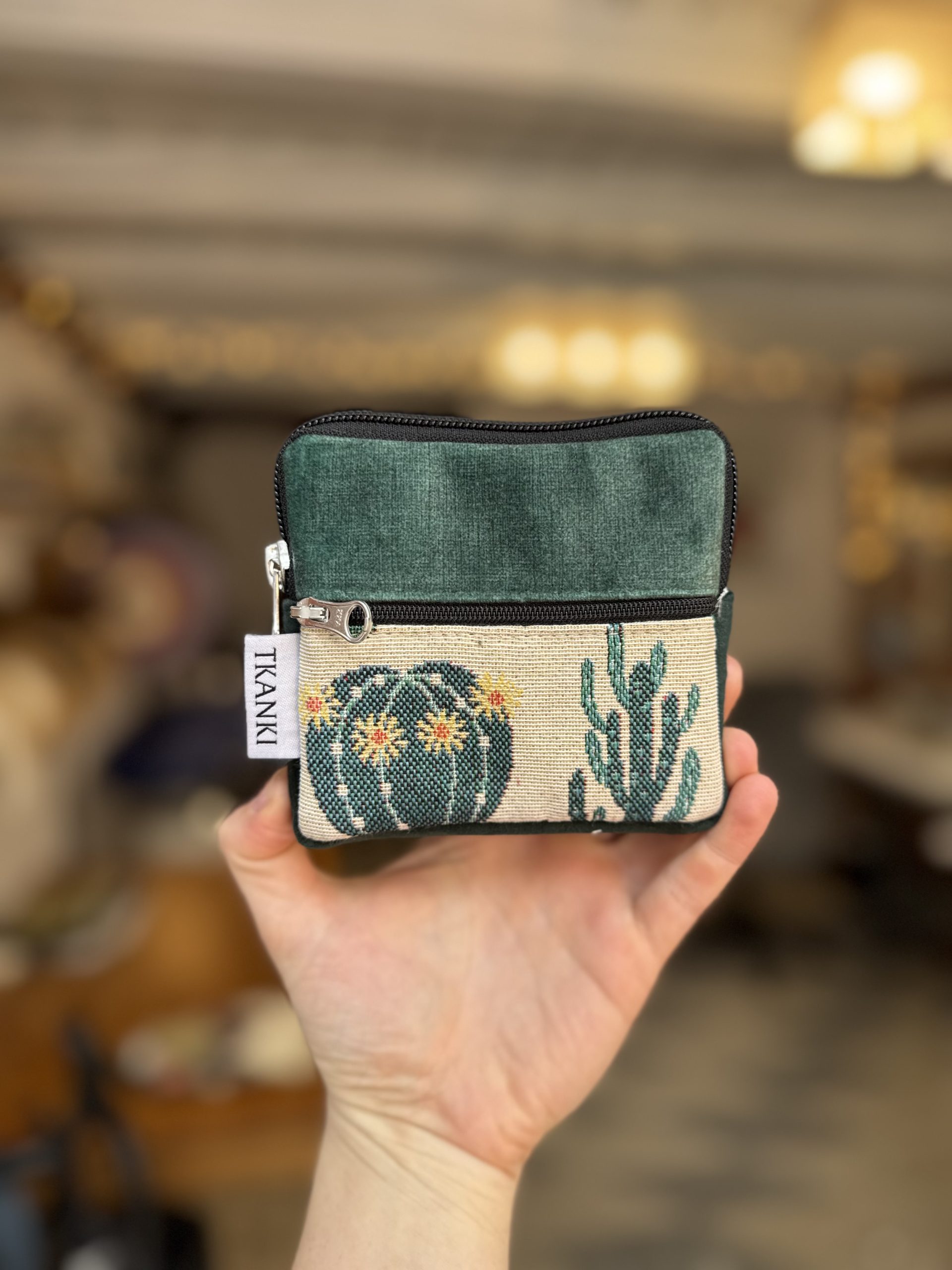 Portfel uszyty w duchu idei zero waste z niepotrzebnych materiałów. Ma dwie kieszenie zapinane na suwak i jedną usztywnianą przegródkę w środku na karty. Wykończony bawełnianą podszewką. Portfelik uszyty w jednym egzemplarzu, od początku od końca powstawał w naszej pracowni.