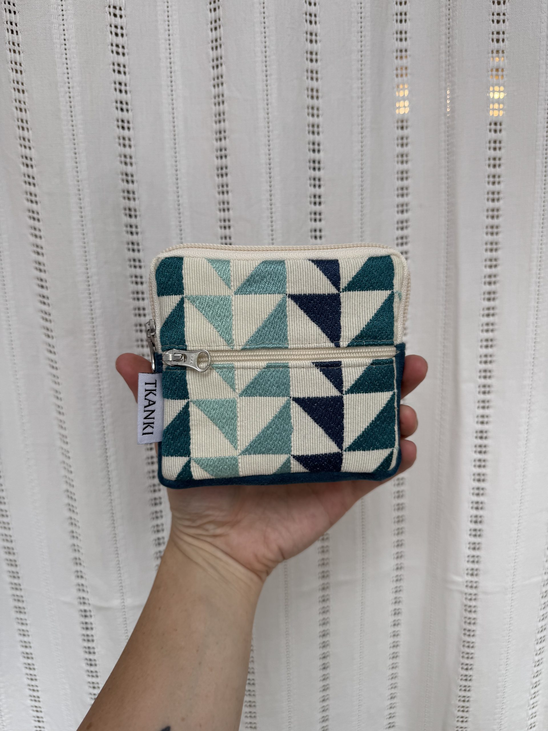 Portfel uszyty w duchu idei zero waste z niepotrzebnych materiałów. Ma dwie kieszenie zapinane na suwak i jedną usztywnianą przegródkę w środku na karty. Wykończony bawełnianą podszewką. Portfelik uszyty w jednym egzemplarzu, od początku od końca powstawał w naszej pracowni.