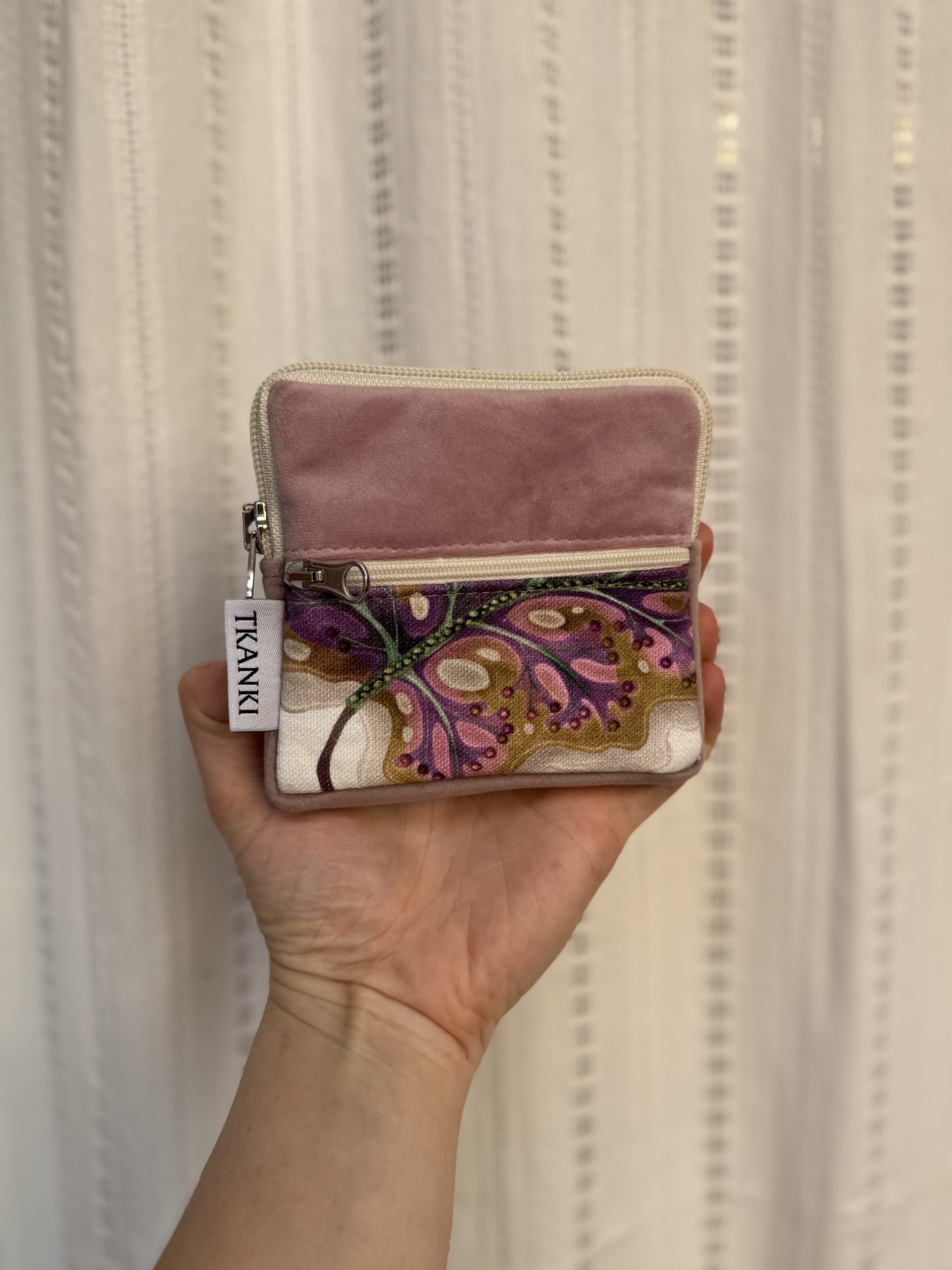 Portfel uszyty w duchu idei zero waste z niepotrzebnych materiałów. Ma dwie kieszenie zapinane na suwak i jedną usztywnianą przegródkę w środku na karty. Wykończony bawełnianą podszewką. Portfelik uszyty w jednym egzemplarzu, od początku od końca powstawał w naszej pracowni.