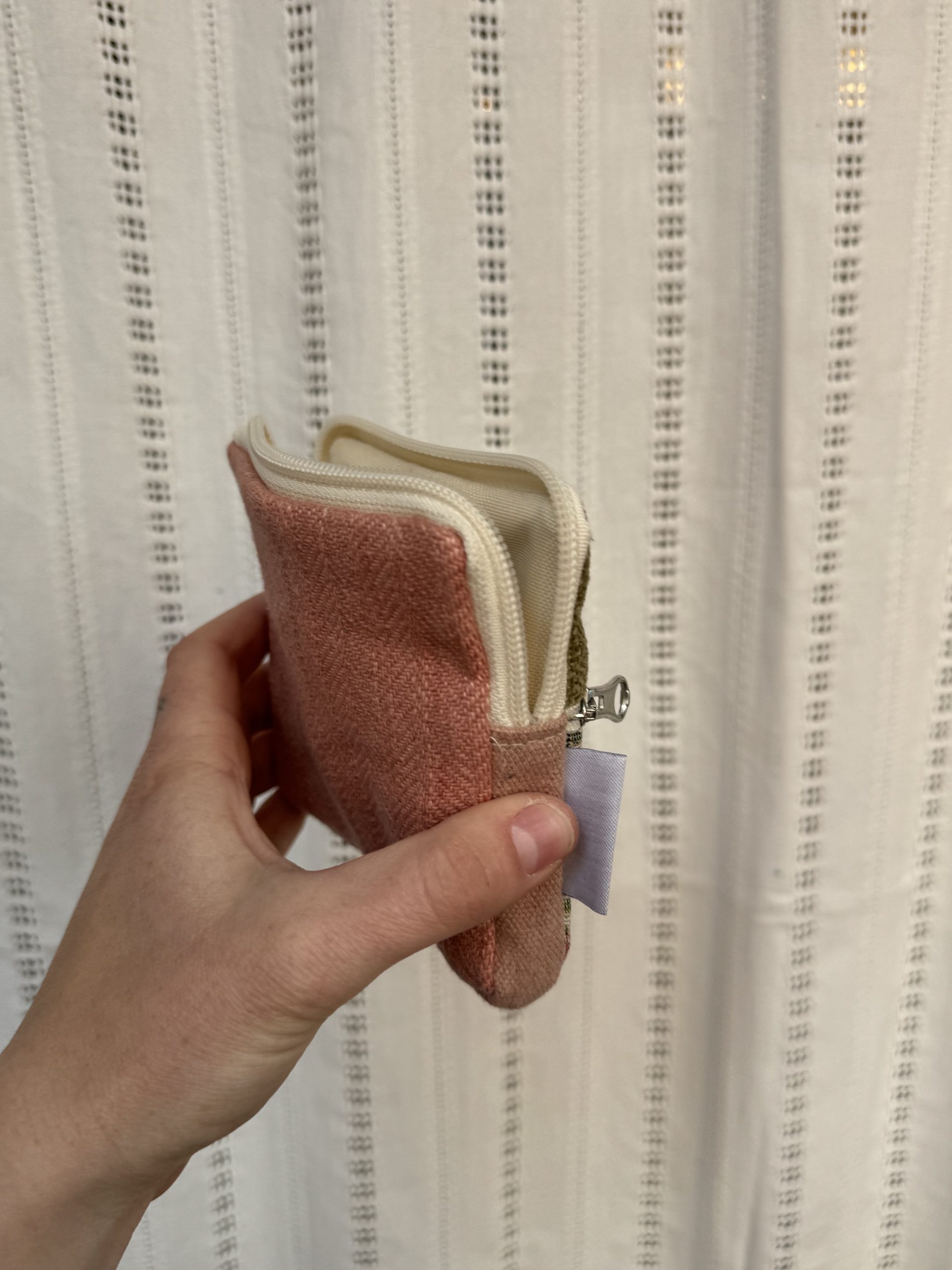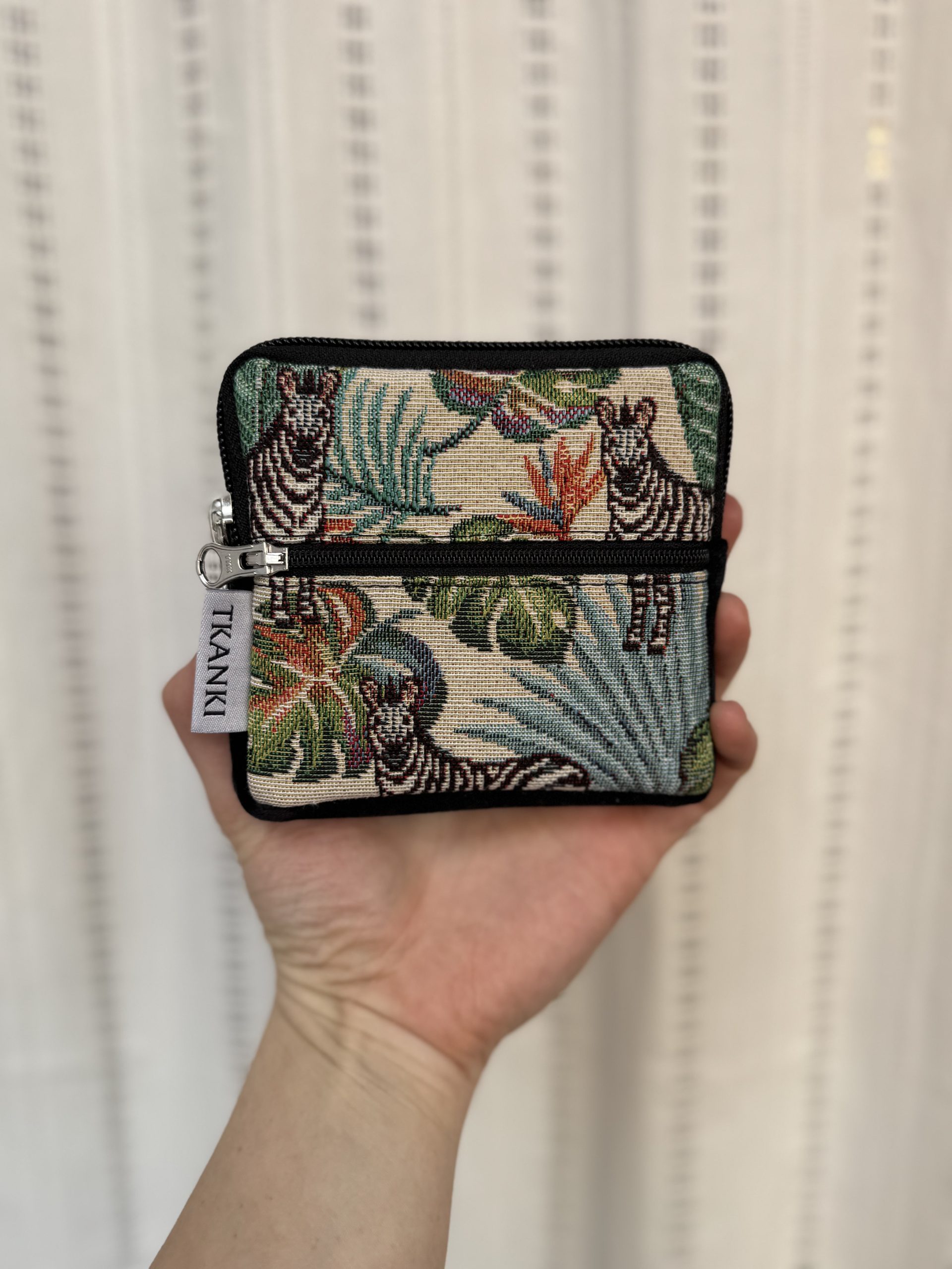 Portfel uszyty w duchu idei zero waste z niepotrzebnych materiałów. Ma dwie kieszenie zapinane na suwak i jedną usztywnianą przegródkę w środku na karty. Wykończony bawełnianą podszewką. Portfelik uszyty w jednym egzemplarzu, od początku od końca powstawał w naszej pracowni.