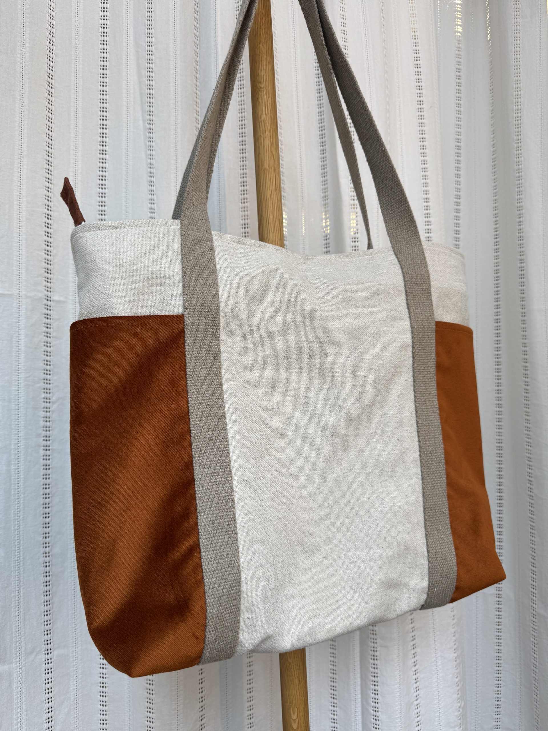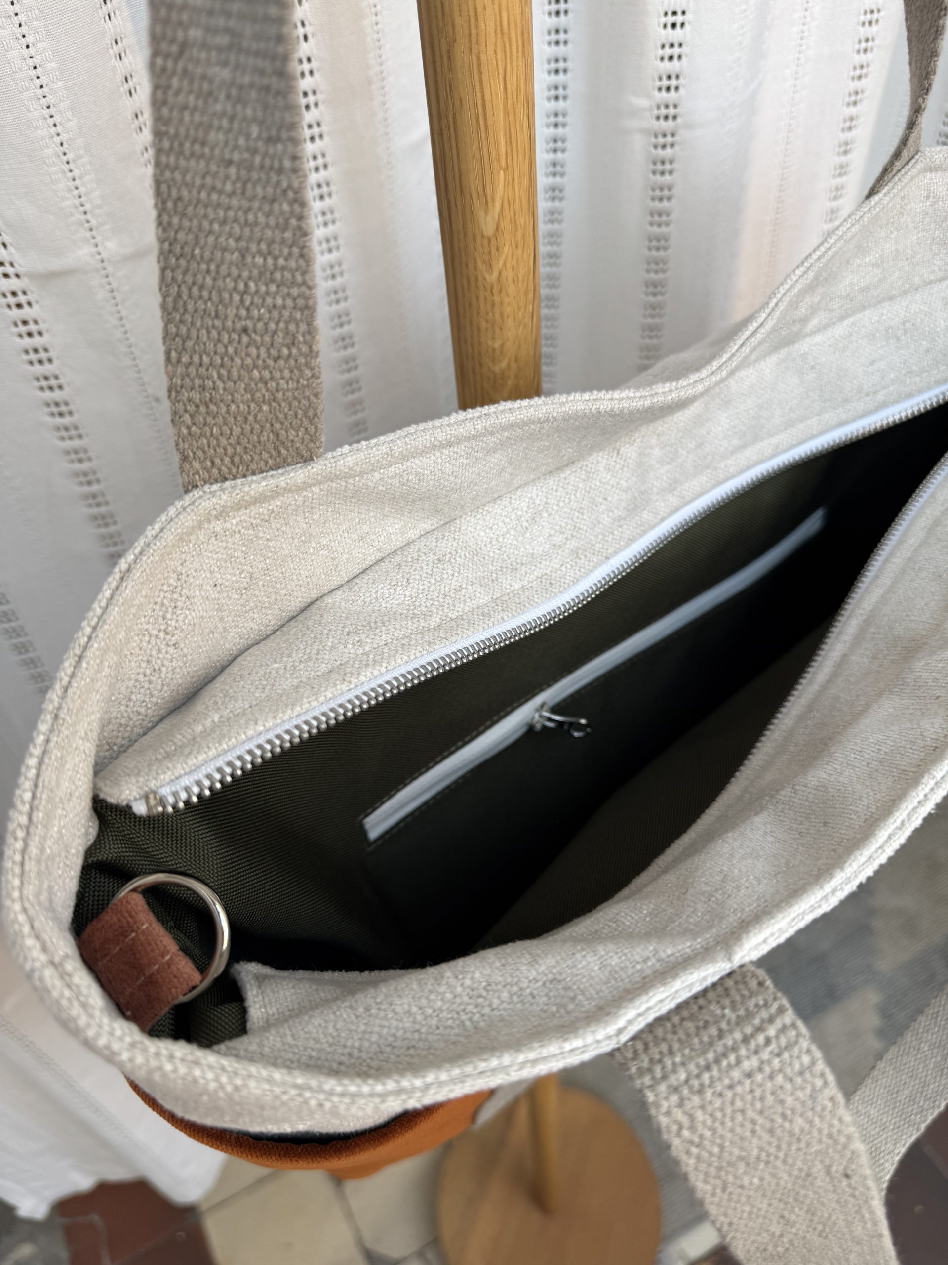 Torba uszyta ze ścinków tapicerskich tkanin. Ma trzy kieszenie z przodu z czego dwie wyższe przechodzą na tył. Torba jest zapinana na suwak, a w środku jest wykończona wodoodporną podszewką. W środku znajduje się kieszeń zapinana na suwak i elastyczna smycz na klucze. Przy zamku doszyte są dwa dyskretne kółeczka, które umożliwiają przypięcie torby do wózka lub noszenie jej przez ramię, w tym celu najlepiej jest dokupić doczepiany pasek.