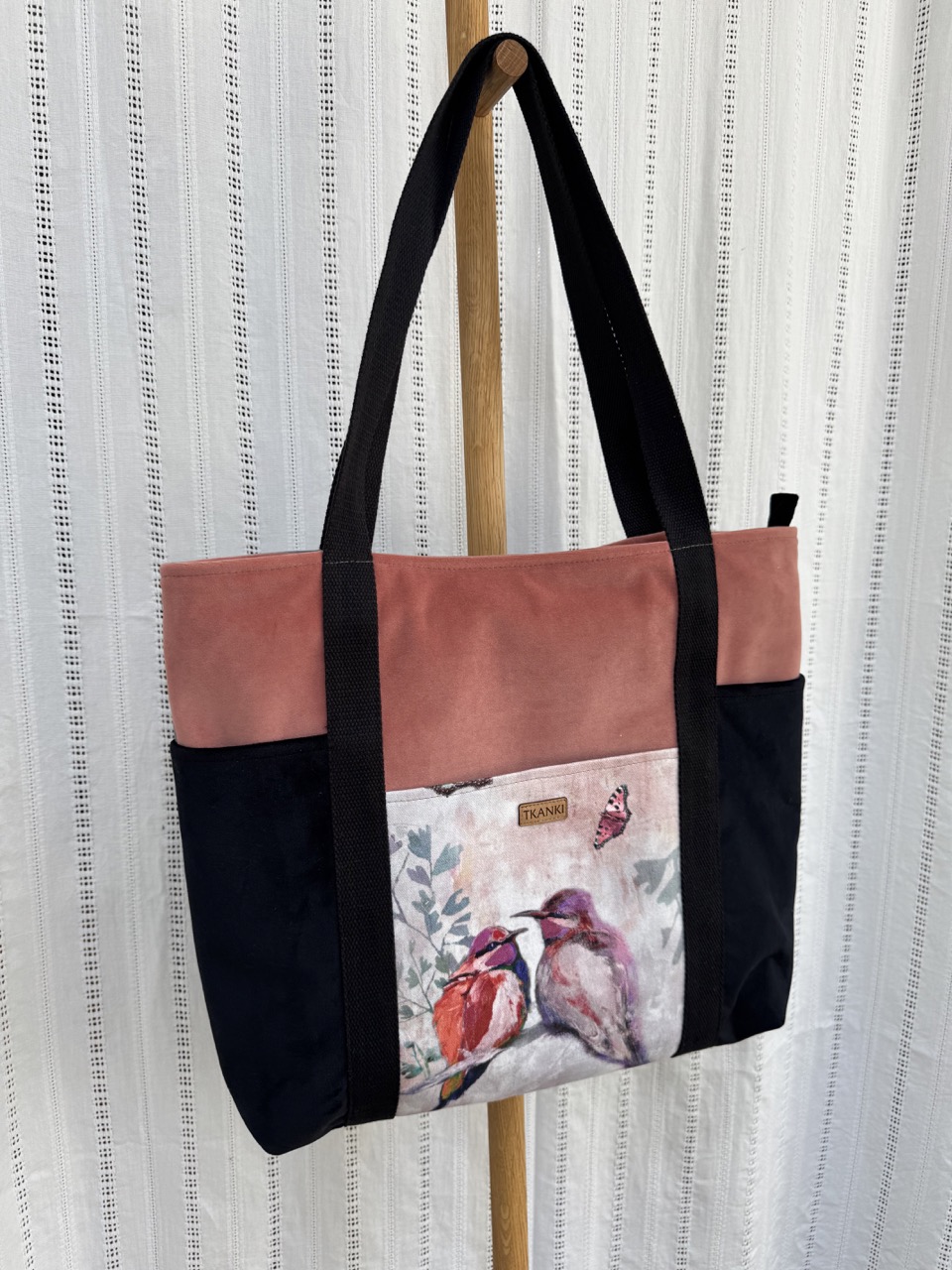 Torebka uszyta tylko w jednym egzemplarzu. Wykończona wodoodporną podszewką, ma kieszeń z przodu zapinaną na mocny zatrzask magnetyczny, w środku mniejsza kieszonka zapinana na suwak i karabińczyk do kluczy na elastycznej taśmie. Torebka zapinana na metalowy zamek wysokiej jakości. Uszyta ze ścinków tkanin tapicerskich, usztywniana. Z przodu ma wszytą elegancką wypustkę. Torebka pięknie się układa niezależnie od tego, czy w środku jest mniej czy więcej rzeczy. Z przodu naszyta subtelna metka z washpapy.